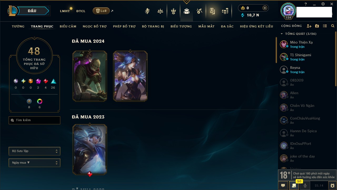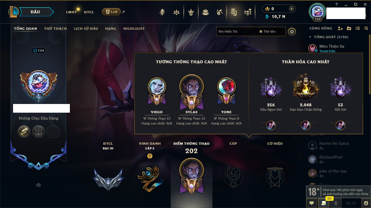 Rank Đơn: Chưa RankKhung: Chưa có khungTướng: 165 - Còn 3214 THXTrang Phục: 160Rank ĐTCL: Chưa RankLinh Thú: 28
