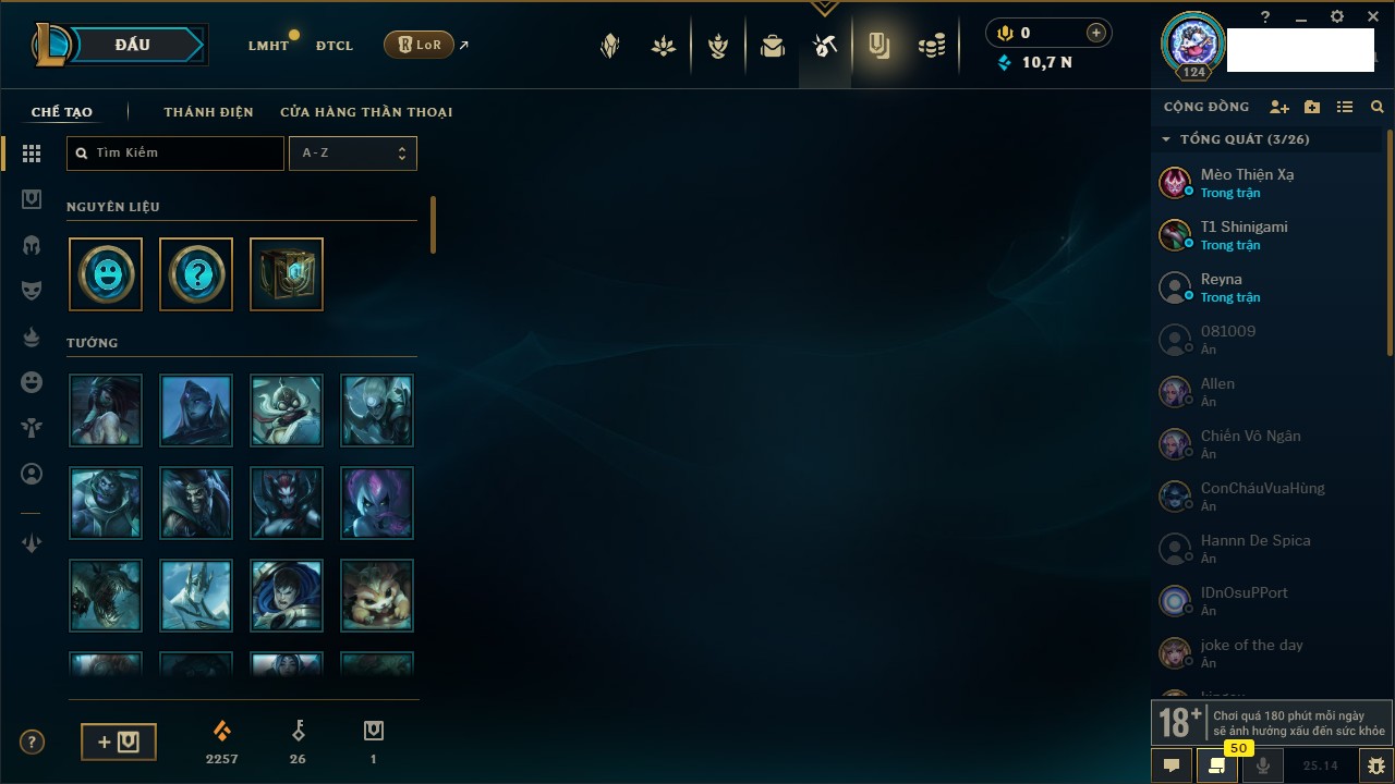 Rank Đơn: Chưa RankKhung: Chưa có khungTướng: 37 - Còn 27387 THXTrang Phục: 10Rank ĐTCL: Chưa RankLinh Thú: 1