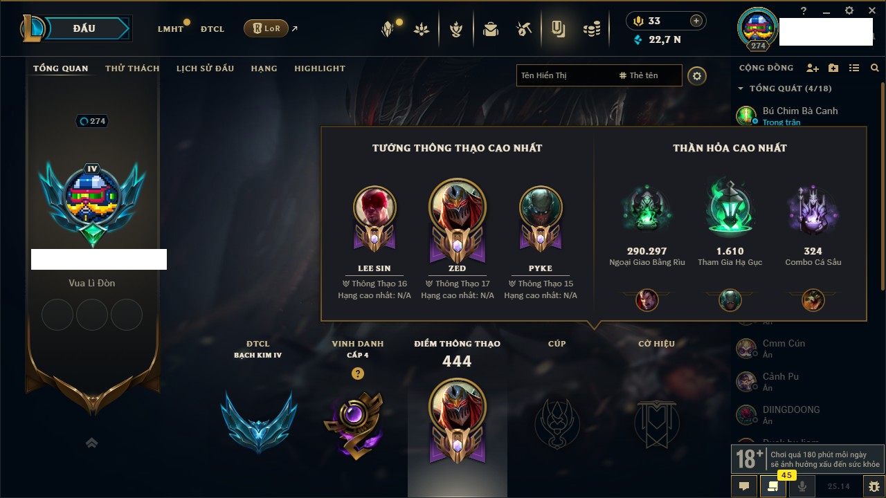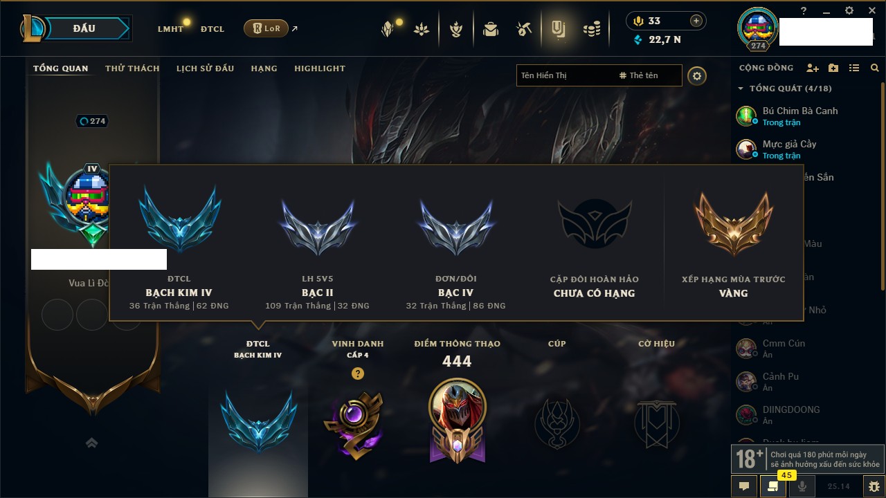 Rank Đơn: Lục Bảo IVKhung: Bạch kimTướng: 171 - Còn 128452 THXTrang Phục: 193Rank ĐTCL: Bạc IIILinh Thú: 100