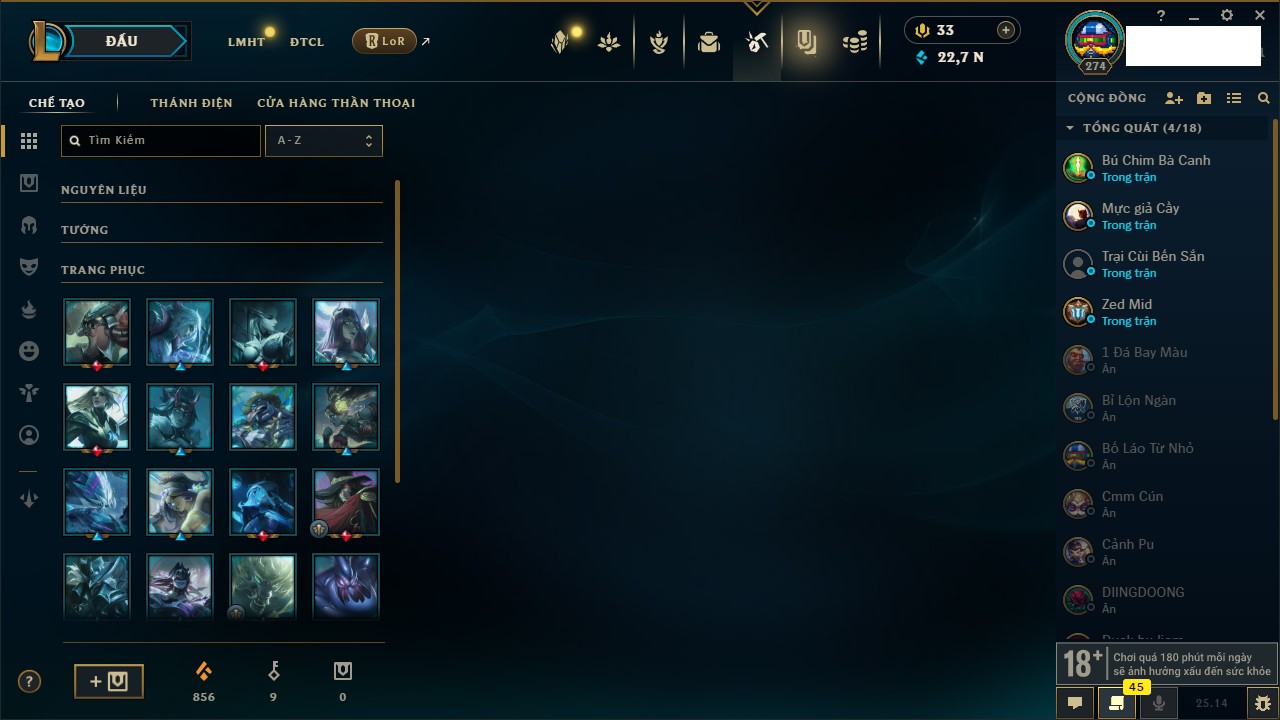 Rank Đơn: Vàng IIIKhung: BạcTướng: 171 - Còn 101359 THXTrang Phục: 88Rank ĐTCL: Kim Cương IVLinh Thú: 200