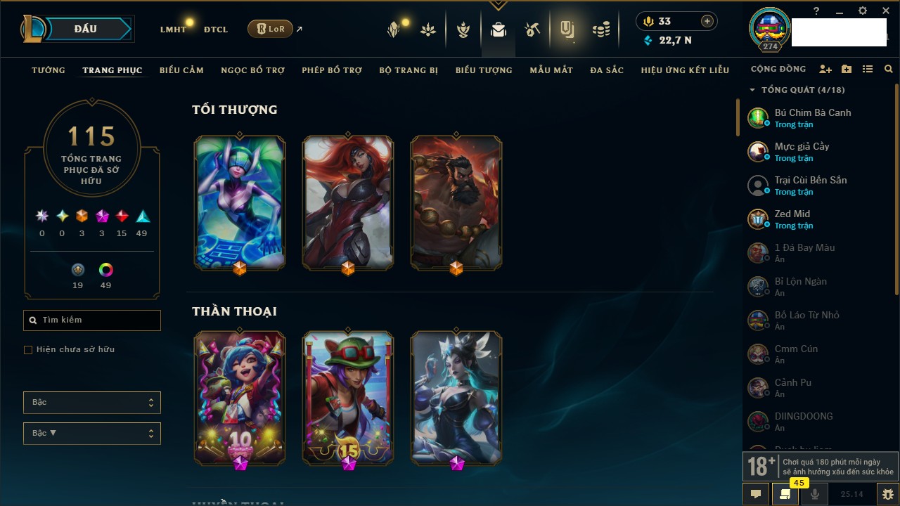 Rank Đơn: Đồng IKhung: ĐồngTướng: 168 - Còn 11447 THXTrang Phục: 245Rank ĐTCL: Chưa RankLinh Thú: 53