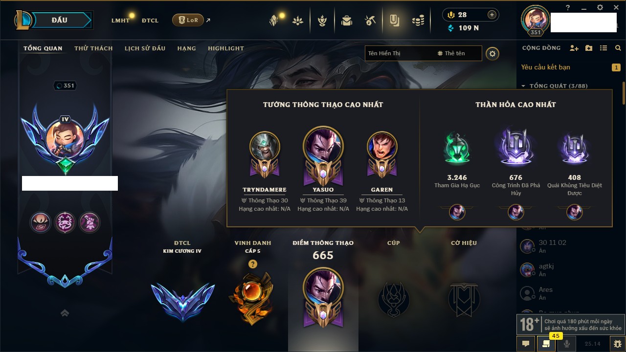 Rank Đơn: Bạch Kim IIKhung: Bạch kimTướng: 171 - Còn 316137 THXTrang Phục: 89Rank ĐTCL: Bạch Kim IIILinh Thú: 94