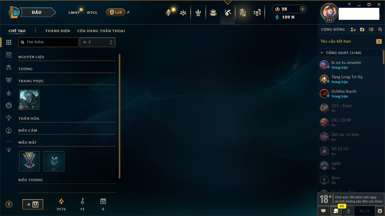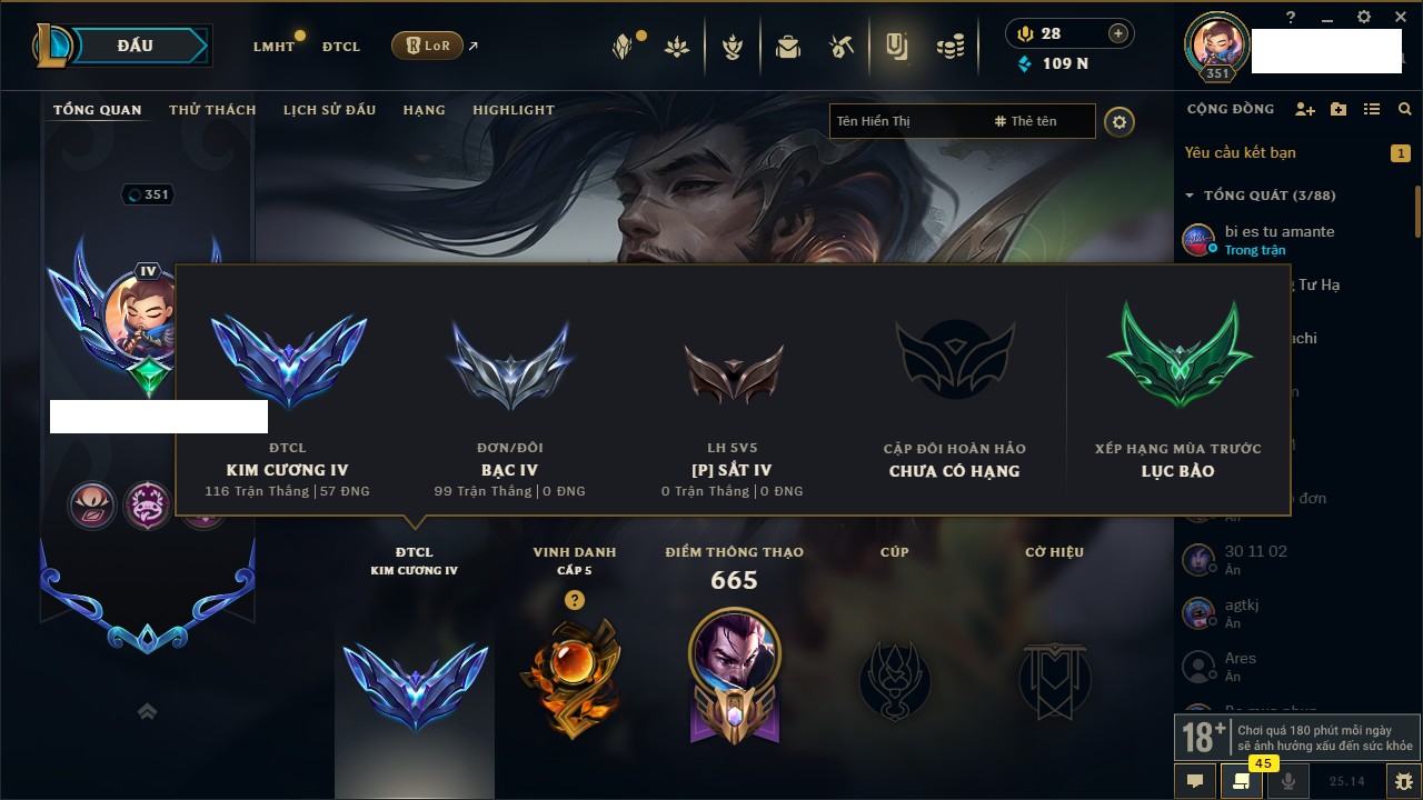 Rank Đơn: Lục Bảo IVKhung: VàngTướng: 171 - Còn 154648 THXTrang Phục: 203Rank ĐTCL: Bạch Kim IVLinh Thú: 69