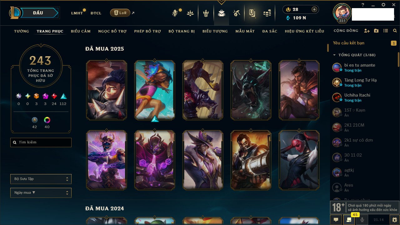 Rank Đơn: Vàng IIKhung: VàngTướng: 170 - Còn 243330 THXTrang Phục: 230Rank ĐTCL: Chưa RankLinh Thú: 68