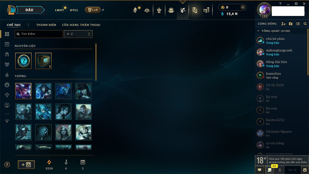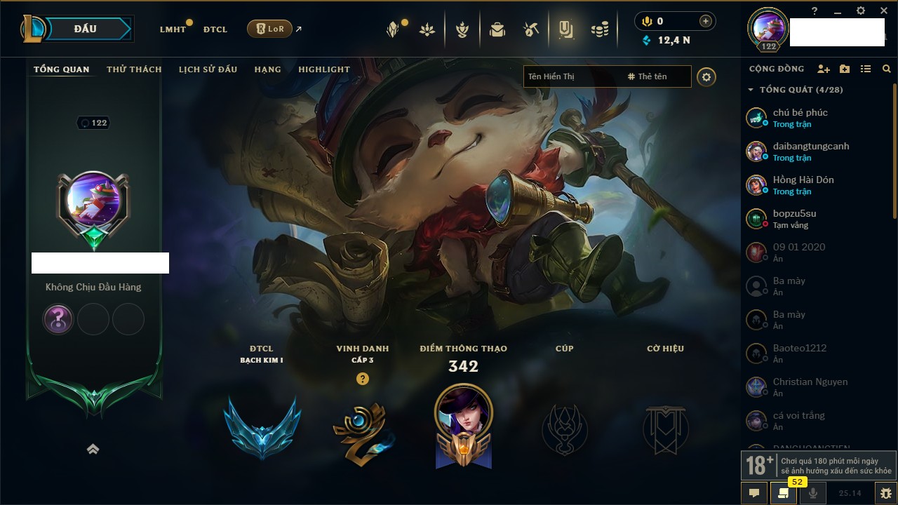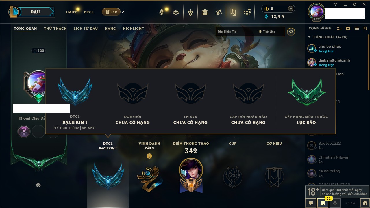 Rank Đơn: Bạch Kim IIKhung: Bạch kimTướng: 171 - Còn 263986 THXTrang Phục: 306Rank ĐTCL: Lục Bảo IVLinh Thú: 96