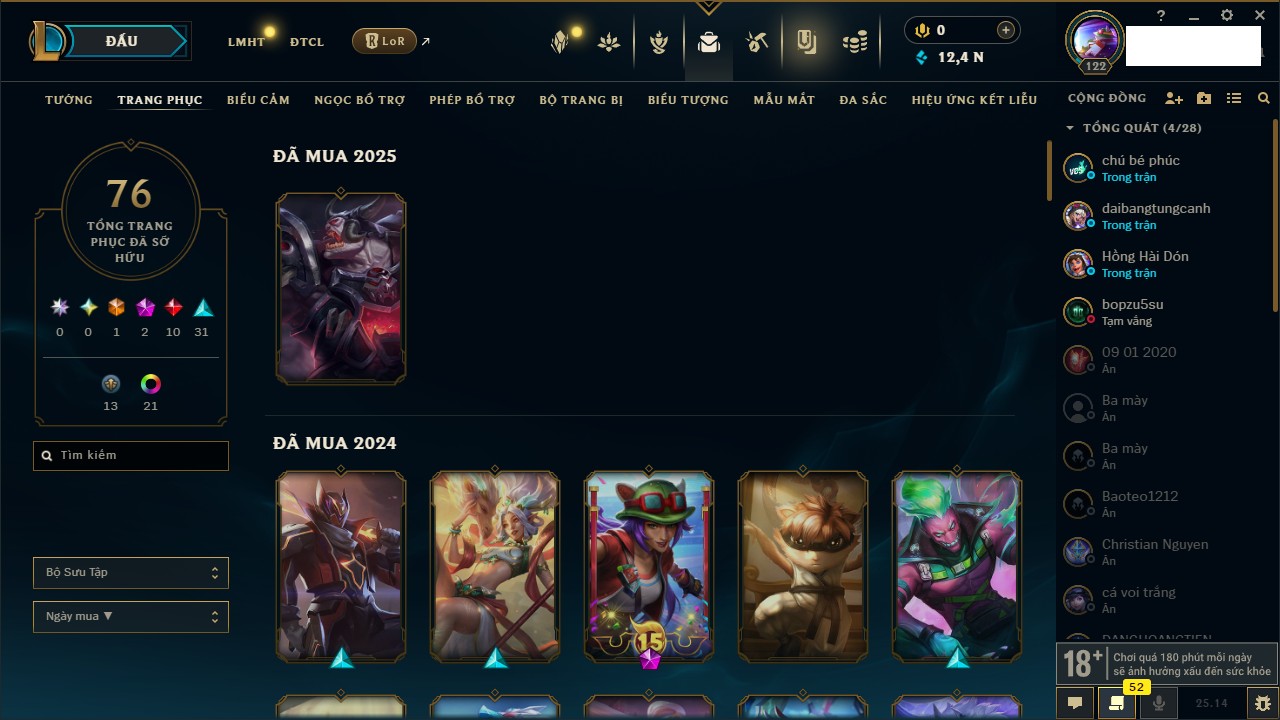 Rank Đơn: Đồng IIIKhung: ĐồngTướng: 170 - Còn 48082 THXTrang Phục: 272Rank ĐTCL: Chưa RankLinh Thú: 84