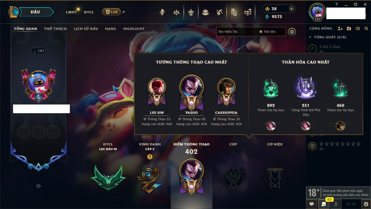 Rank Đơn: Chưa RankKhung: Chưa có khungTướng: 65 - Còn 2075 THXTrang Phục: 10Rank ĐTCL: Chưa RankLinh Thú: 72