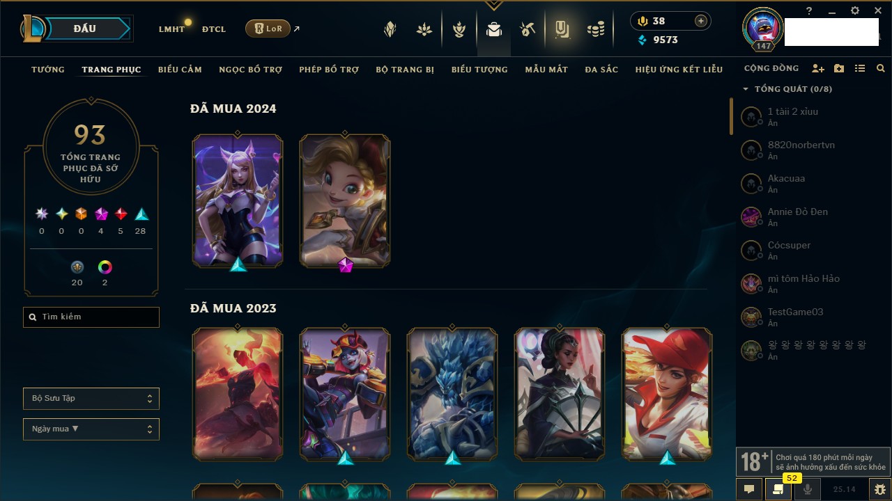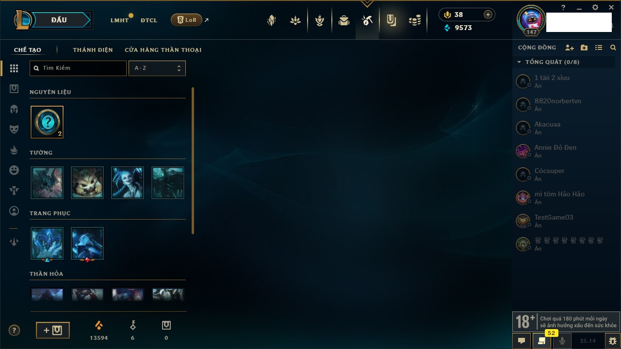Rank Đơn: Chưa RankKhung: Chưa có khungTướng: 170 - Còn 13795 THXTrang Phục: 75Rank ĐTCL: Chưa RankLinh Thú: 176