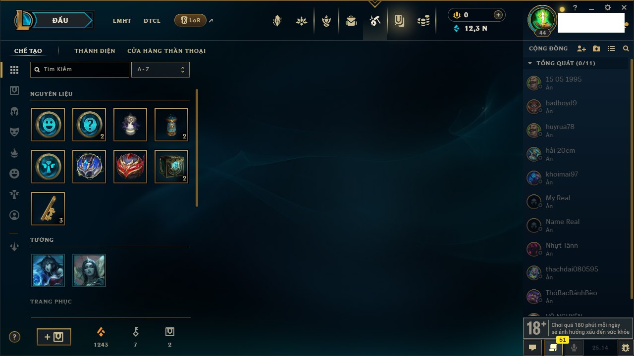 Rank Đơn: Đồng IIKhung: Chưa có khungTướng: 170 - Còn 56487 THXTrang Phục: 90Rank ĐTCL: Chưa RankLinh Thú: 129