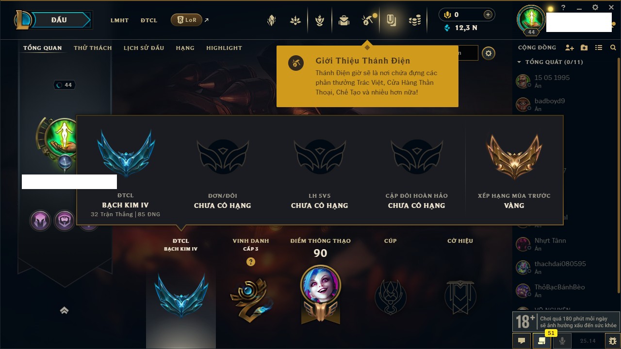 Rank Đơn: Vàng IVKhung: VàngTướng: 146 - Còn 89110 THXTrang Phục: 63Rank ĐTCL: Vàng IIILinh Thú: 41
