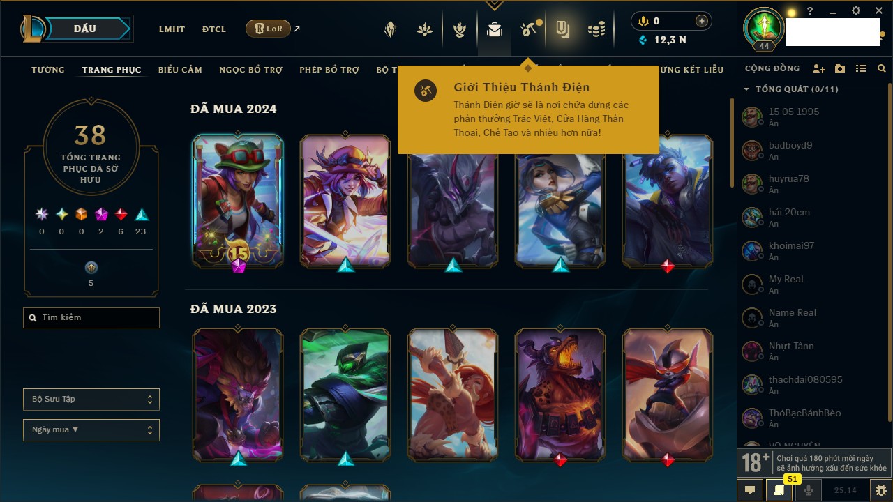 Rank Đơn: Vàng IIIKhung: VàngTướng: 170 - Còn 33222 THXTrang Phục: 136Rank ĐTCL: Chưa RankLinh Thú: 40