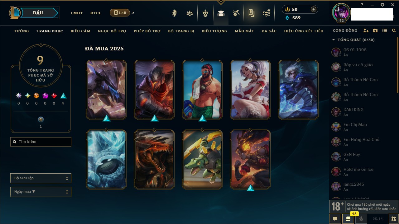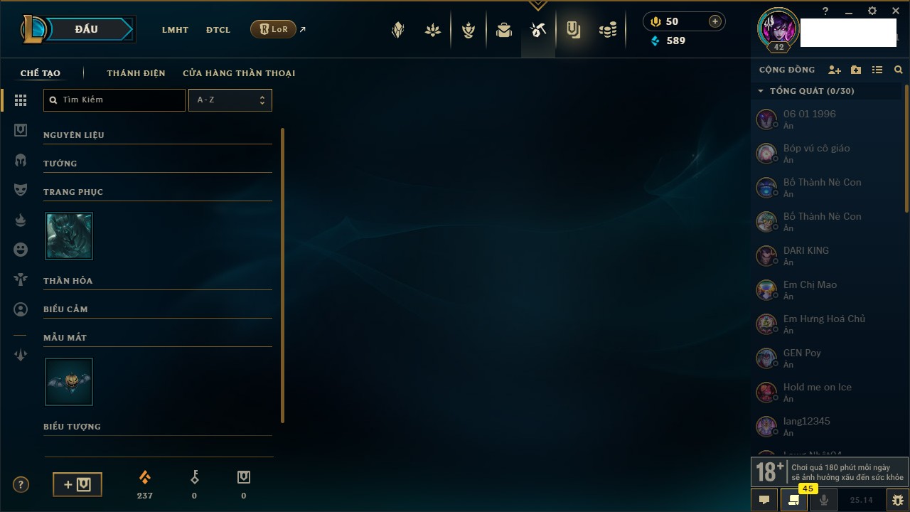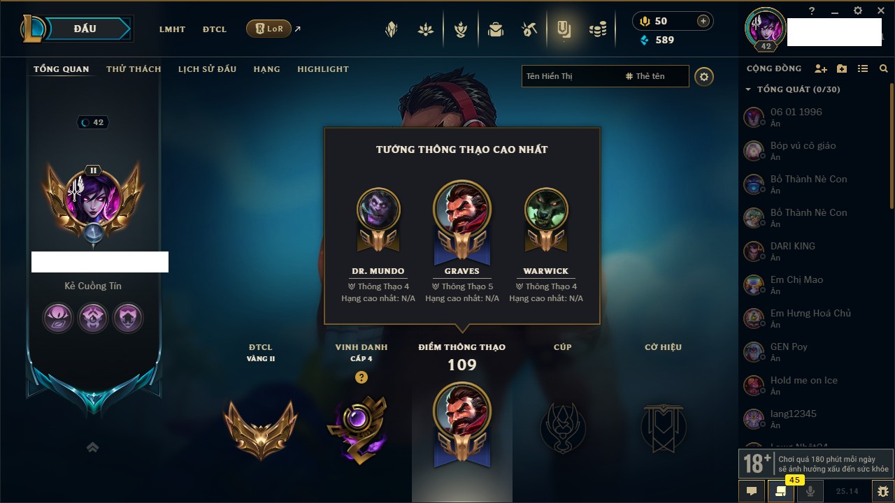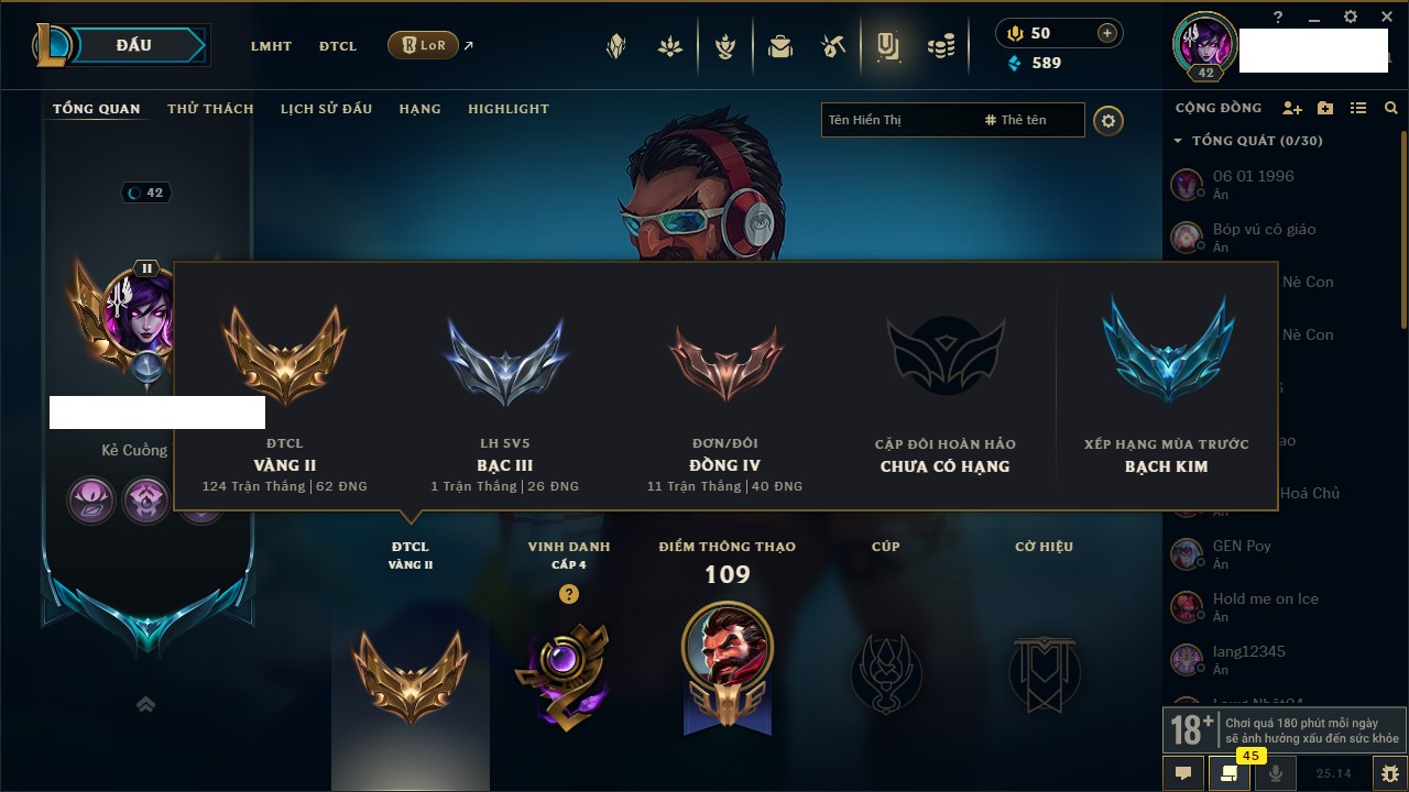 Rank Đơn: Đồng IVKhung: Chưa có khungTướng: 89 - Còn 589 THXTrang Phục: 9Rank ĐTCL: Chưa RankLinh Thú: 27