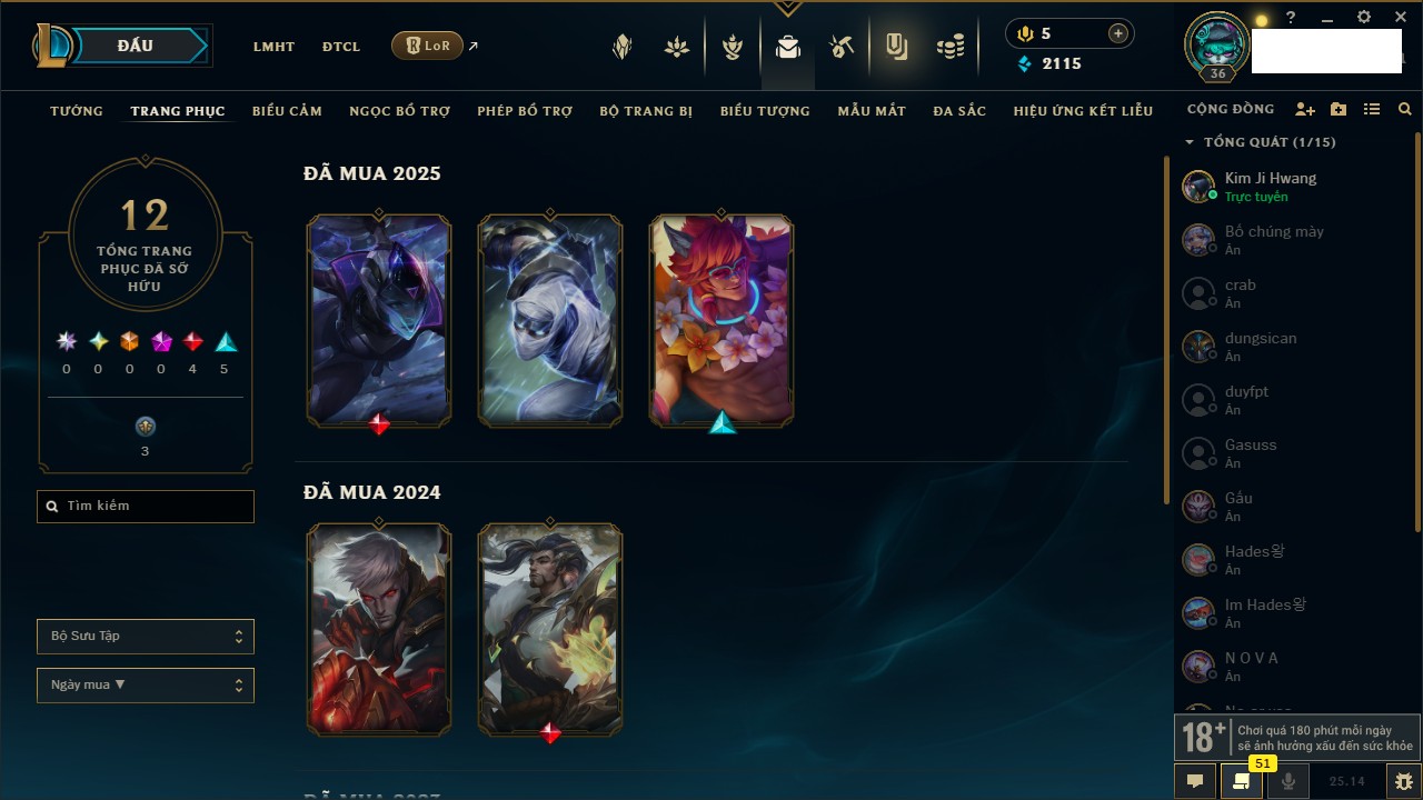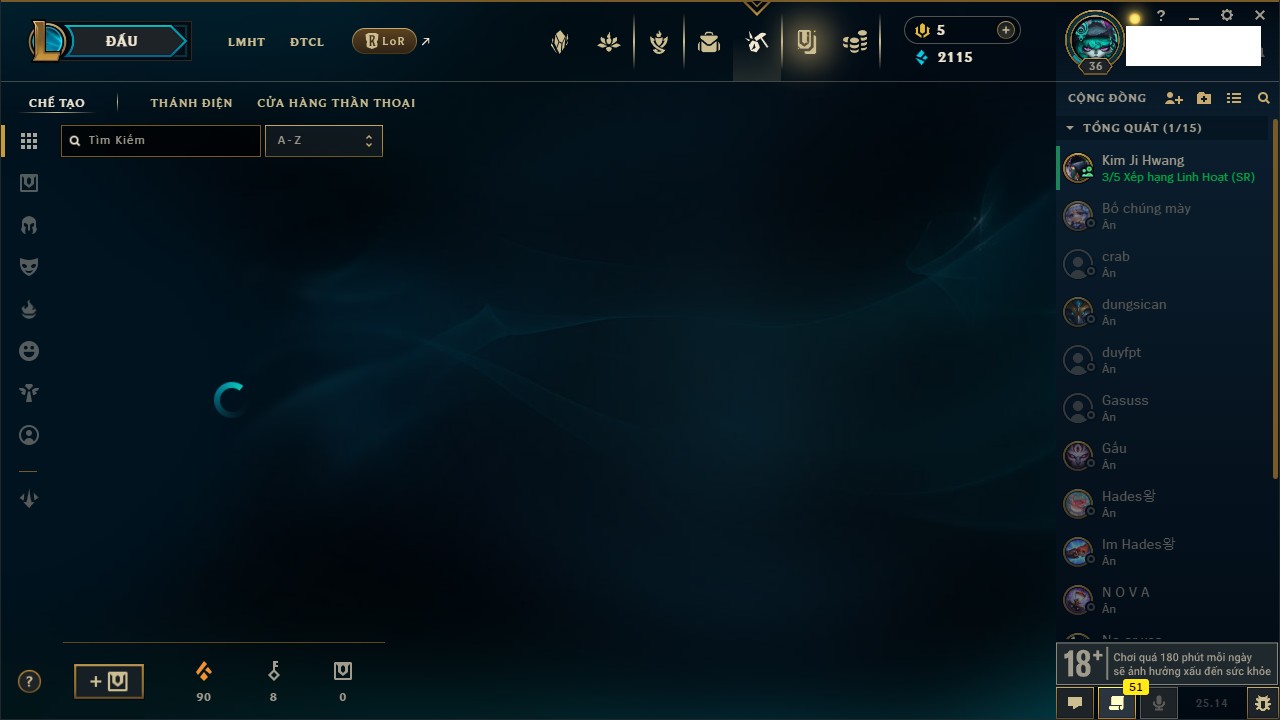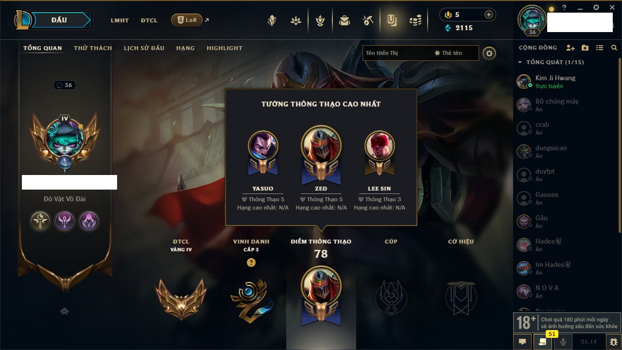 Rank Đơn: Bạc IIKhung: VàngTướng: 171 - Còn 48568 THXTrang Phục: 121Rank ĐTCL: Chưa RankLinh Thú: 30