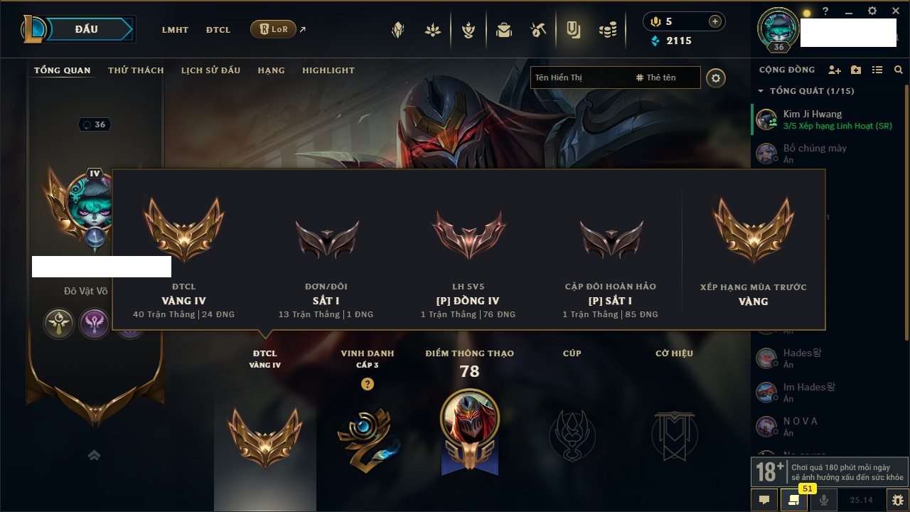 Rank Đơn: Vàng IVKhung: Chưa có khungTướng: 172 - Còn 21557 THXTrang Phục: 229Rank ĐTCL: Chưa RankLinh Thú: 105