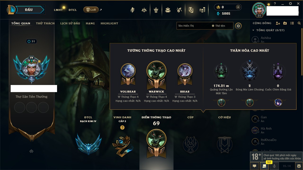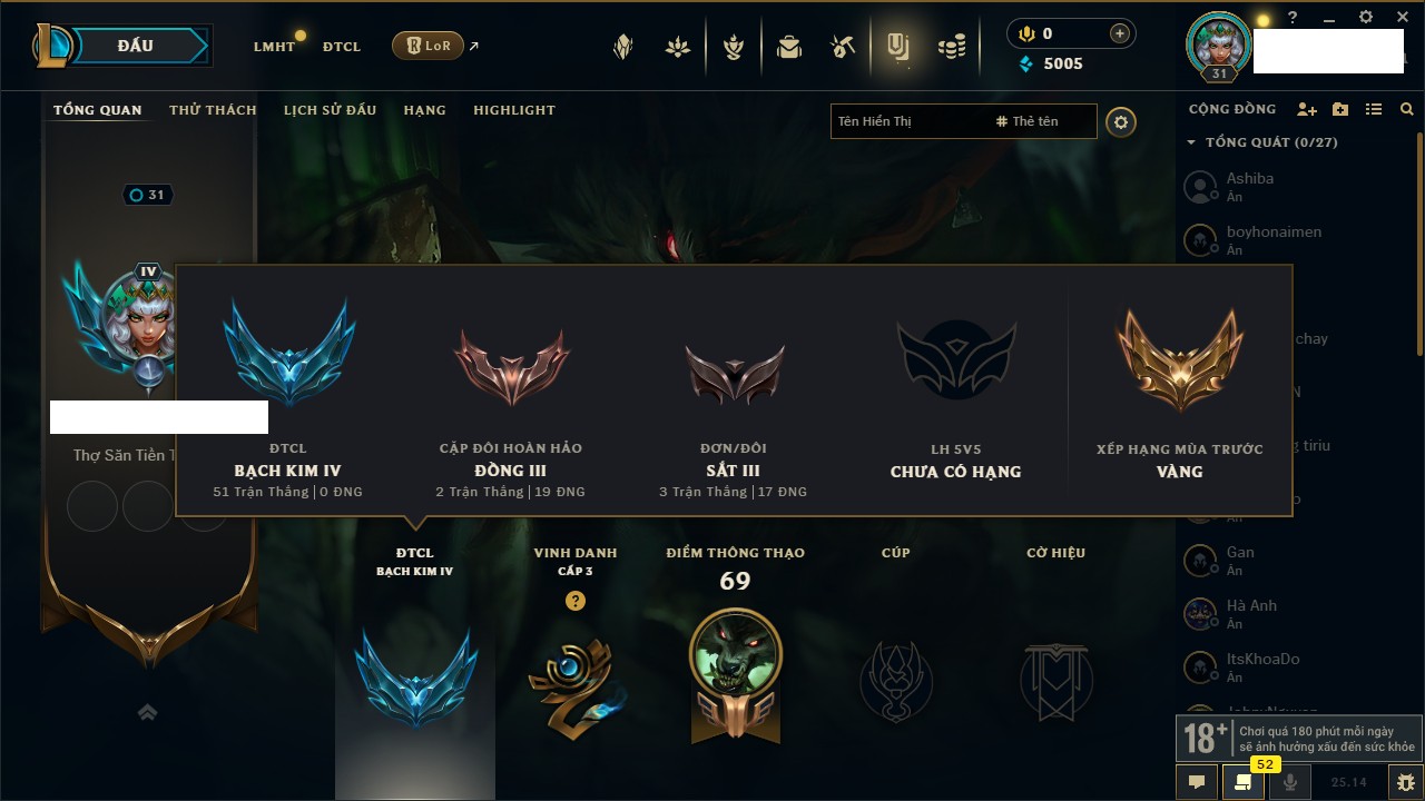 Rank Đơn: Bạc IKhung: Chưa có khungTướng: 159 - Còn 14126 THXTrang Phục: 146Rank ĐTCL: Vàng IVLinh Thú: 172