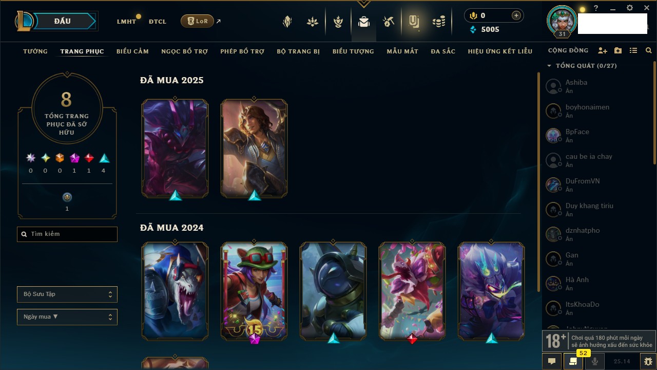 Rank Đơn: Chưa rank mùa nàoKhung: Chưa có khungTướng: 1 - Còn 6000 THXTrang Phục: 0Rank ĐTCL: Chưa rank mùa nàoLinh Thú: 6