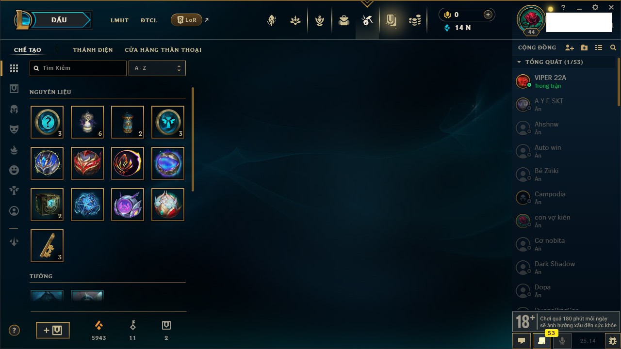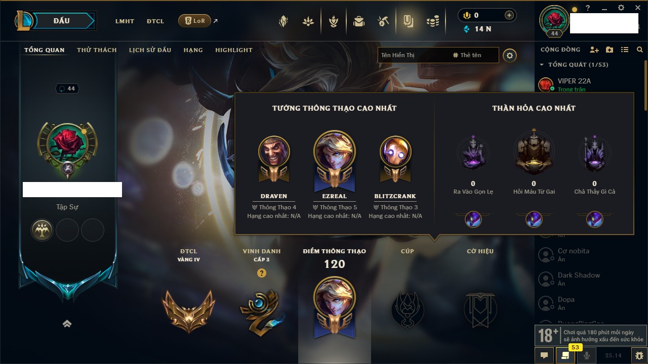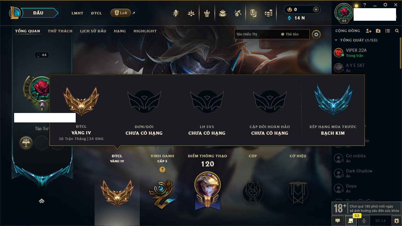 Rank Đơn: Vàng IKhung: Bạch kimTướng: 170 - Còn 212450 THXTrang Phục: 214Rank ĐTCL: Bạch Kim IVLinh Thú: 221