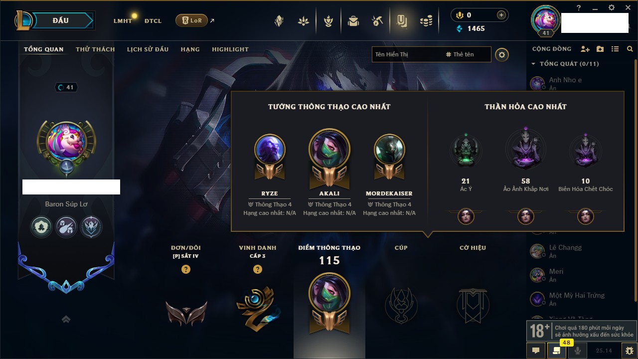Rank Đơn: Chưa Rank Khung: Đồng Tướng: 171 - Còn 82665 THX Trang Phục: 45 Rank ĐTCL: Chưa Rank Linh Thú: 95