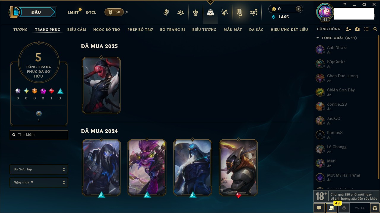 Rank Đơn: Chưa Rank Khung: Chưa có khung Tướng: 171 - Còn 52162 THX Trang Phục: 78 Rank ĐTCL: Chưa Rank Linh Thú: 145