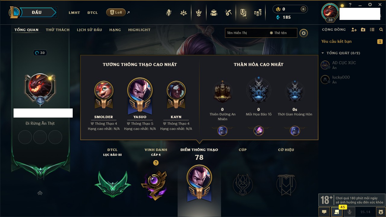 Rank Đơn: Bạc II Khung: Chưa có khung Tướng: 78 - Còn 1629 THX Trang Phục: 31 Rank ĐTCL: Chưa Rank Linh Thú: 51