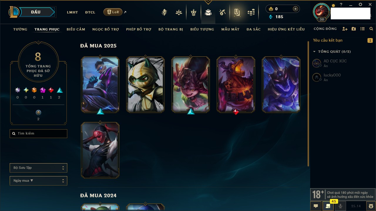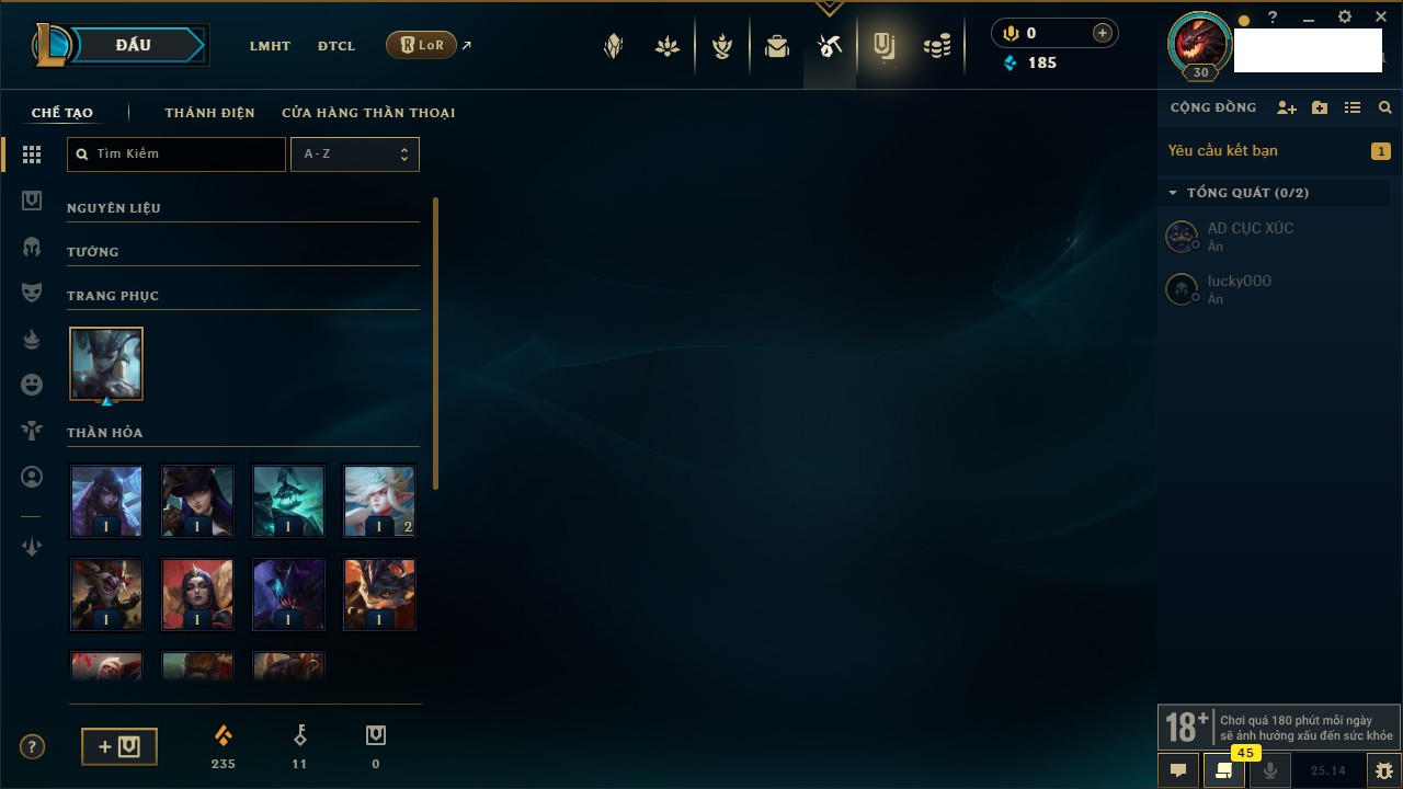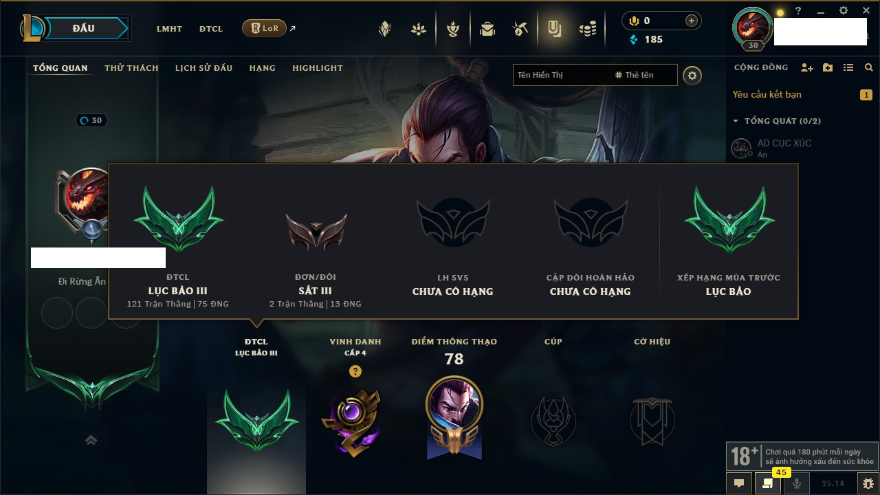 Rank Đơn: Sắt III Khung: Chưa có khung Tướng: 63 - Còn 185 THX Trang Phục: 8 Rank ĐTCL: Chưa Rank Linh Thú: 75