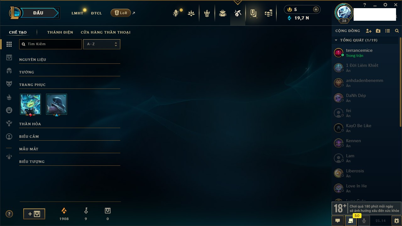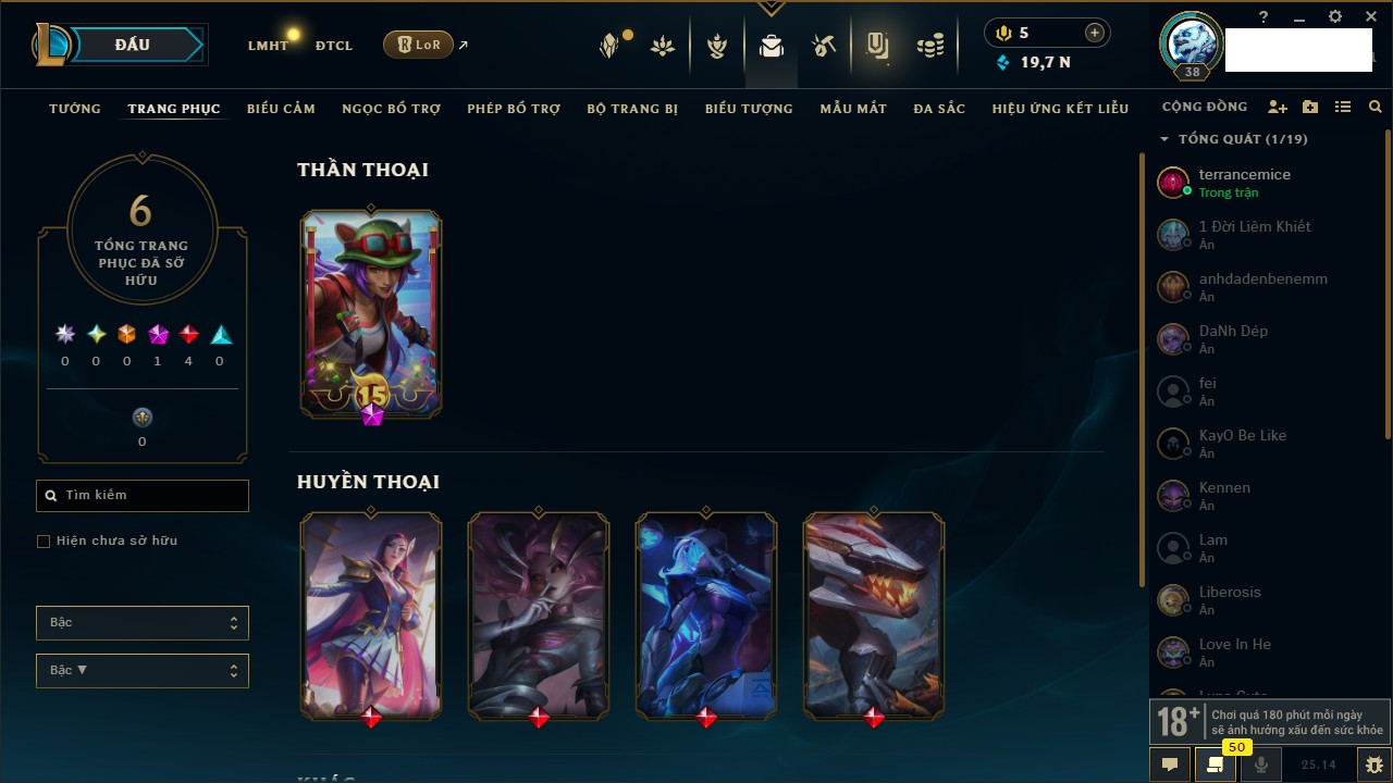 Rank Đơn: Bạch Kim IIIKhung: Bạch kimTướng: 59 - Còn 20316 THXTrang Phục: 29Rank ĐTCL: Chưa RankLinh Thú: 3
