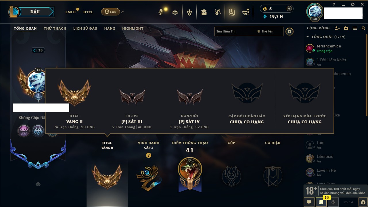 Rank Đơn: Bạc IIIKhung: BạcTướng: 140 - Còn 1624 THXTrang Phục: 36Rank ĐTCL: Chưa RankLinh Thú: 118