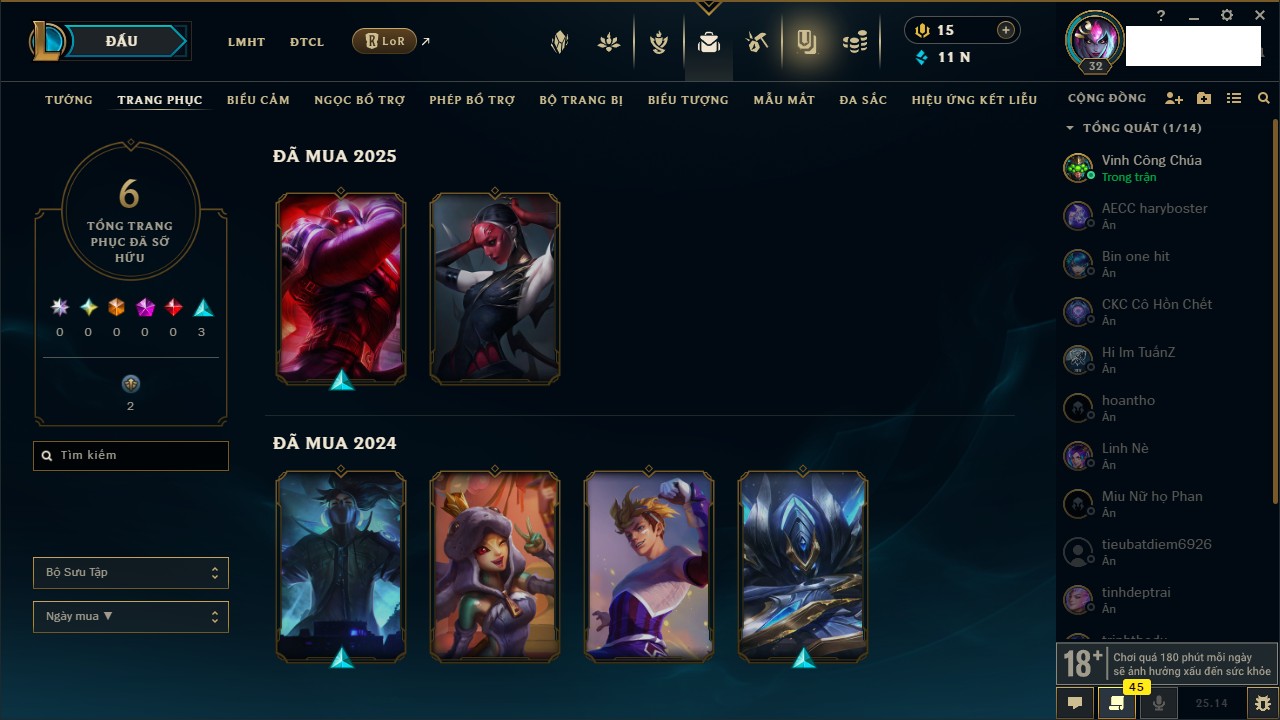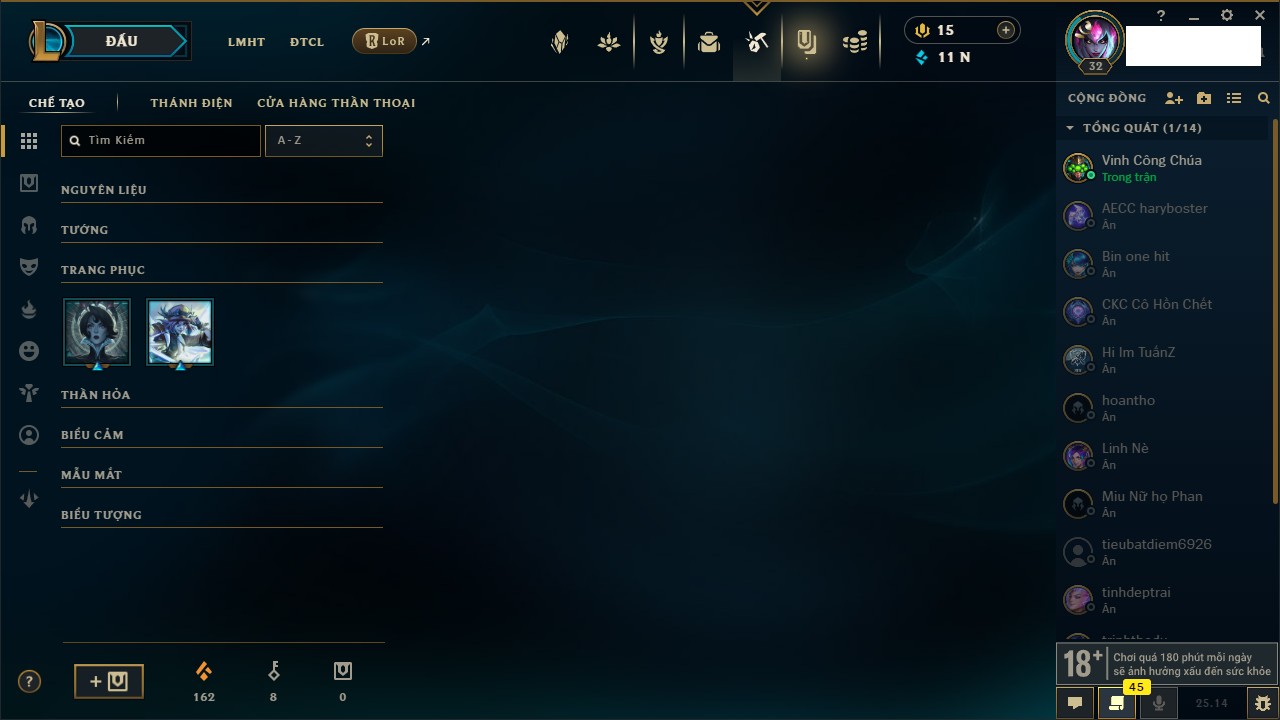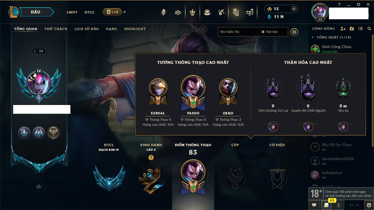 Rank Đơn: Sắt IIIKhung: Chưa có khungTướng: 49 - Còn 11000 THXTrang Phục: 6Rank ĐTCL: Chưa RankLinh Thú: 131