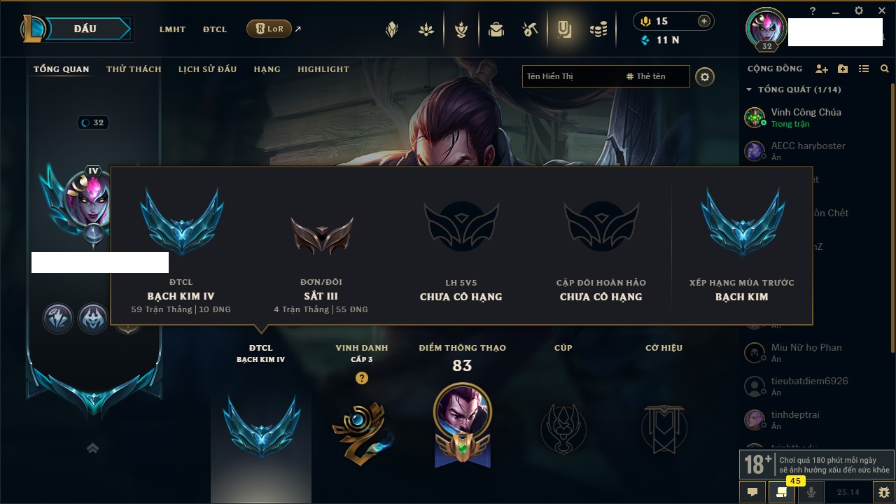 Rank Đơn: Sắt IIIKhung: Chưa có khungTướng: 77 - Còn 8133 THXTrang Phục: 11Rank ĐTCL: Bạch Kim IVLinh Thú: 108