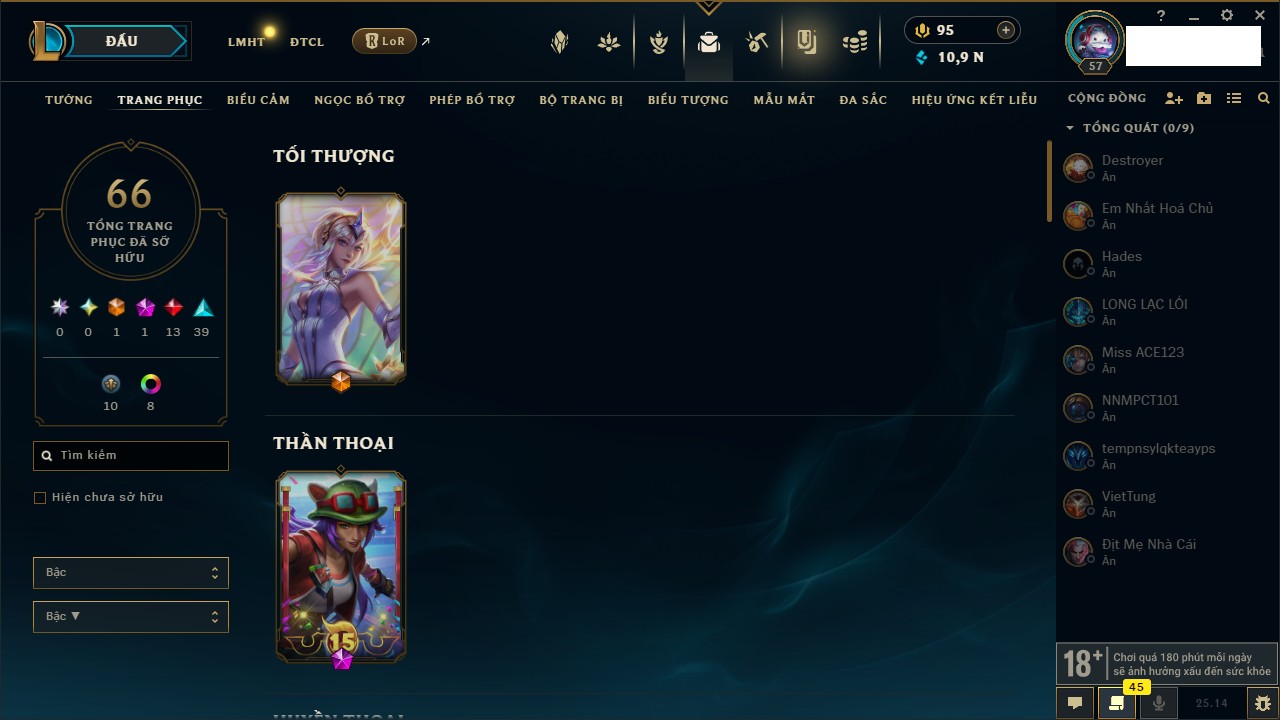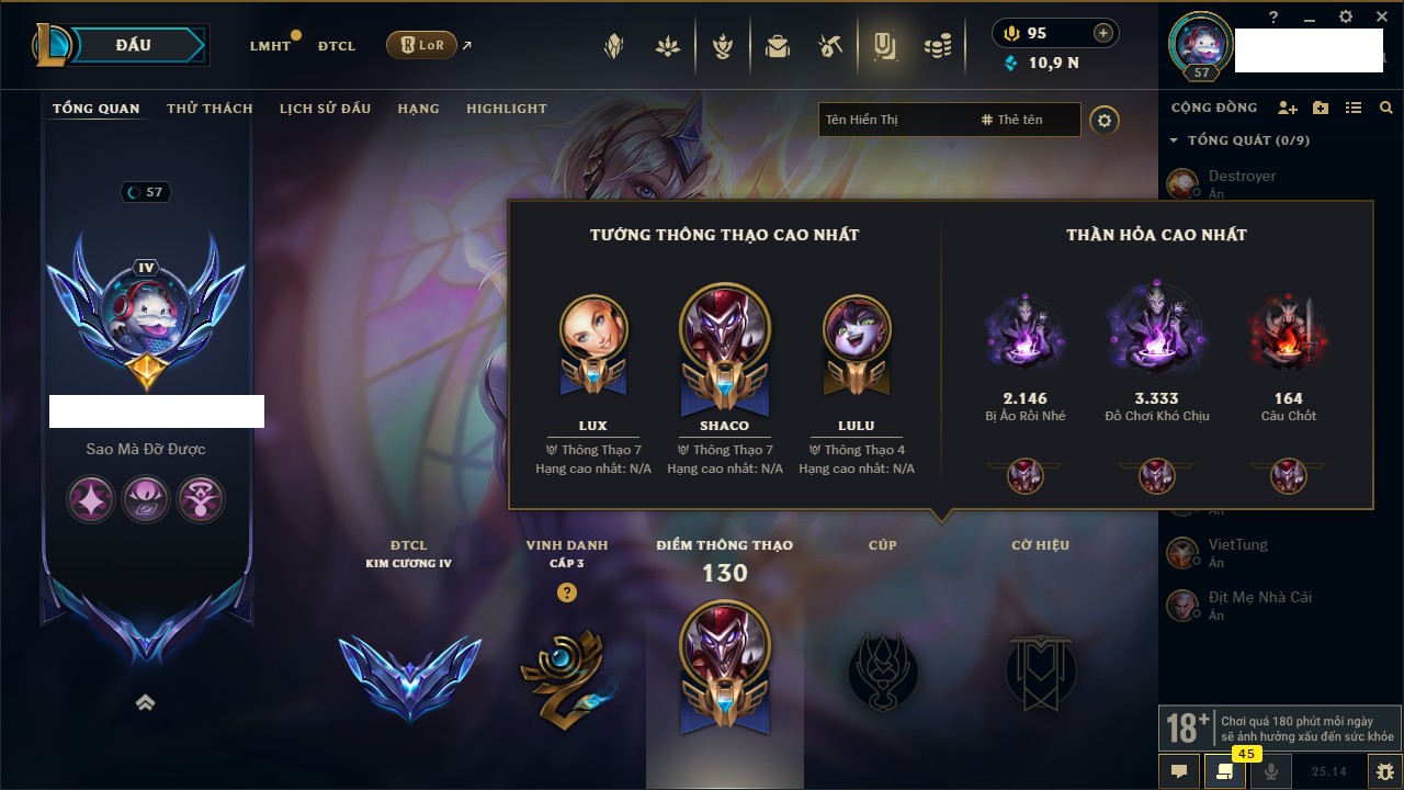 Rank Đơn: Chưa Rank Khung: Vàng Tướng: 171 - Còn 159339 THX Trang Phục: 218 Rank ĐTCL: Chưa Rank Linh Thú: 151