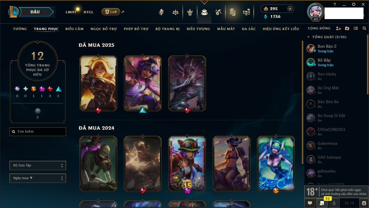 Rank Đơn: Vàng IIIKhung: VàngTướng: 172 - Còn 164704 THXTrang Phục: 255Rank ĐTCL: Kim Cương IVLinh Thú: 156