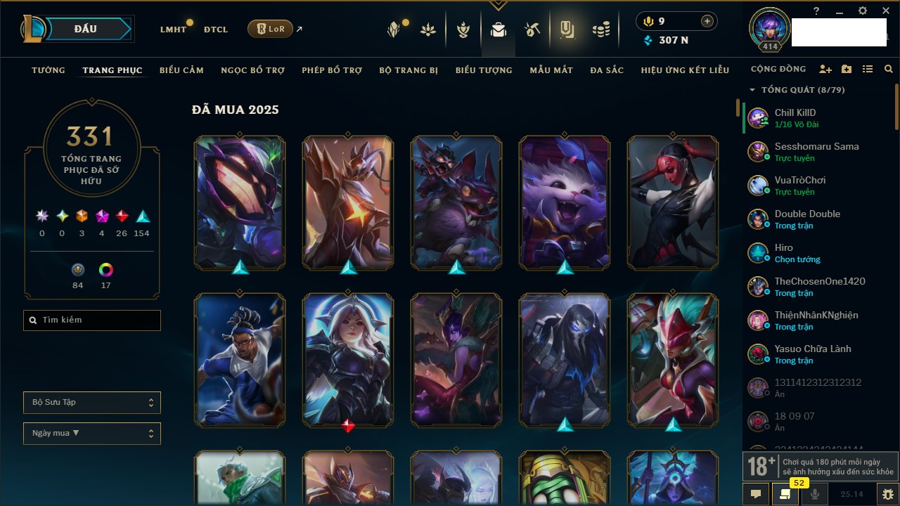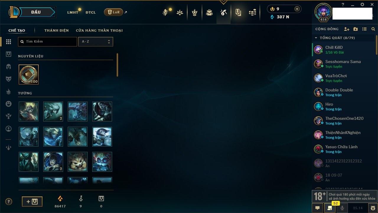 Rank Đơn: Bạch Kim IIKhung: Bạch kimTướng: 171 - Còn 316137 THXTrang Phục: 89Rank ĐTCL: Bạch Kim IIILinh Thú: 94