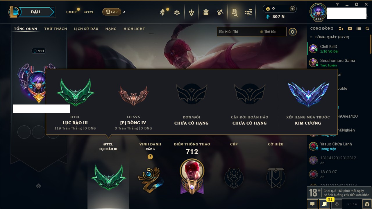 Rank Đơn: Lục Bảo IVKhung: VàngTướng: 171 - Còn 154648 THXTrang Phục: 203Rank ĐTCL: Bạch Kim IVLinh Thú: 69