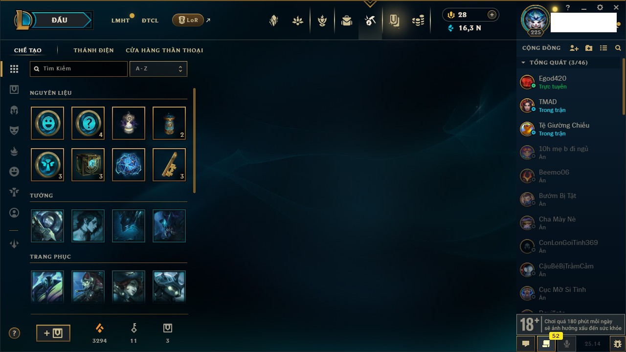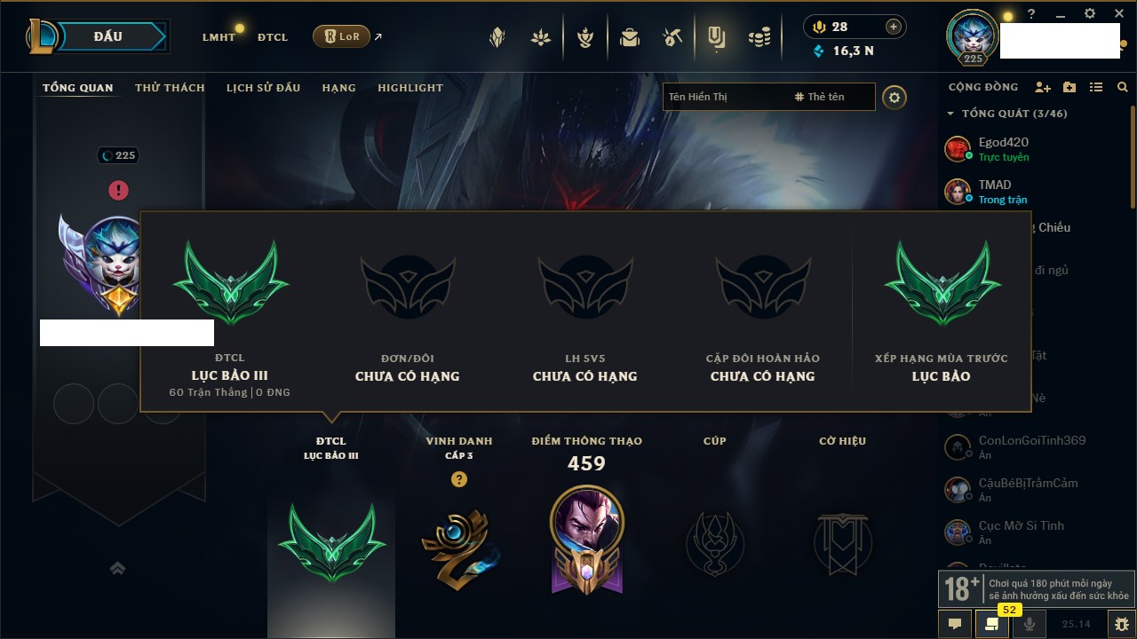Rank Đơn: Vàng IIIKhung: BạcTướng: 171 - Còn 101359 THXTrang Phục: 88Rank ĐTCL: Kim Cương IVLinh Thú: 200