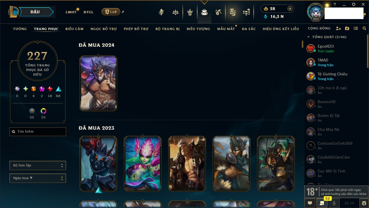 Rank Đơn: Bạc IIIKhung: Chưa có khungTướng: 163 - Còn 66843 THXTrang Phục: 182Rank ĐTCL: Kim Cương IVLinh Thú: 114