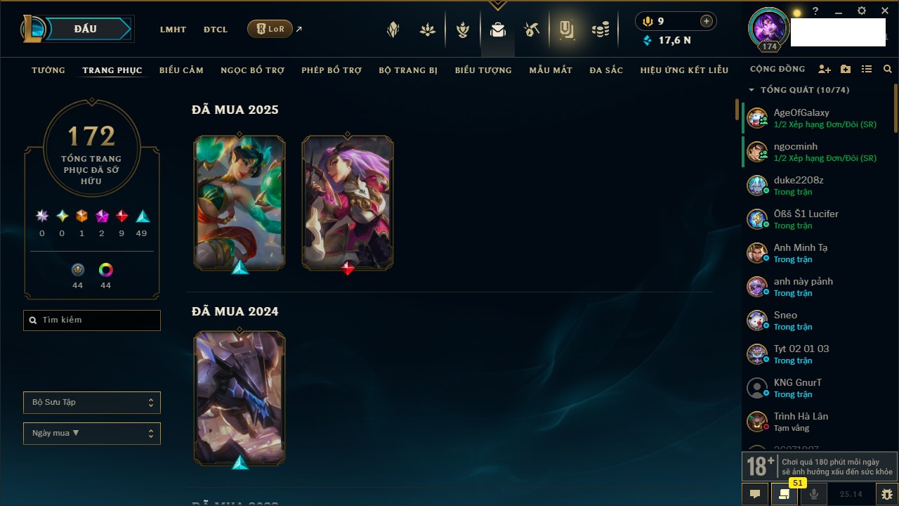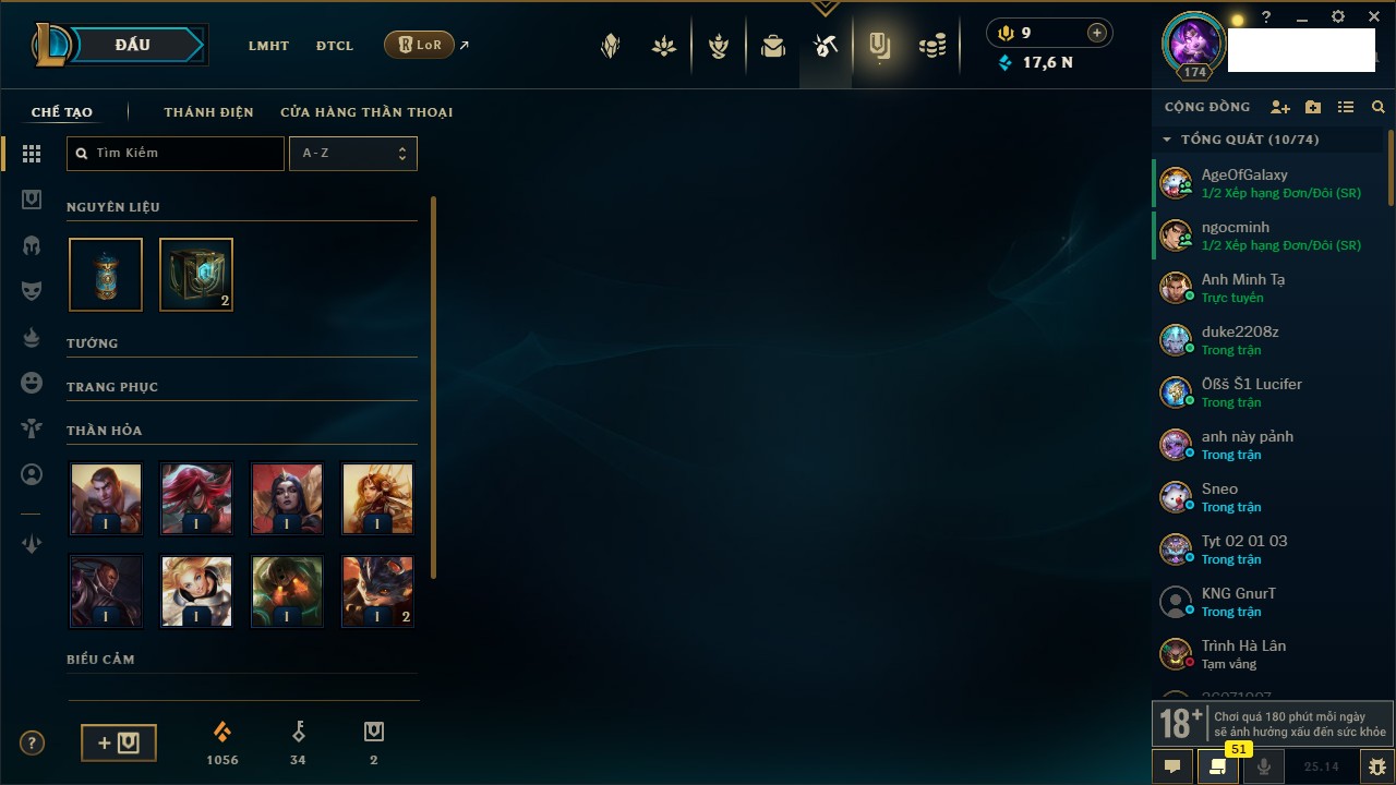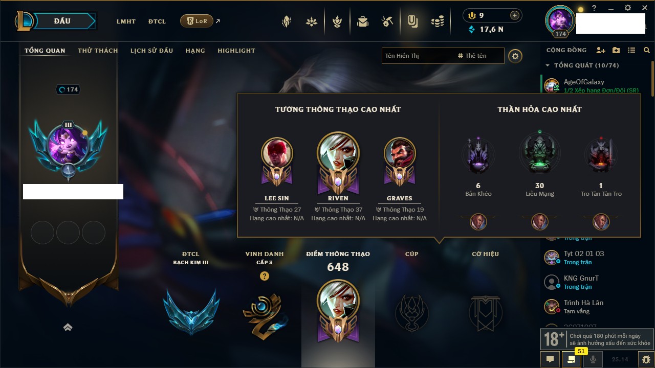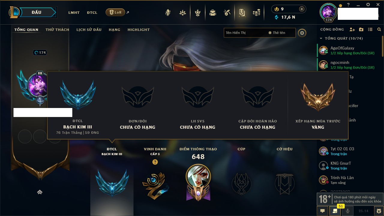 Rank Đơn: Vàng IVKhung: BạcTướng: 166 - Còn 180925 THXTrang Phục: 163Rank ĐTCL: Chưa RankLinh Thú: 67