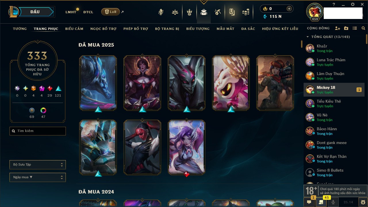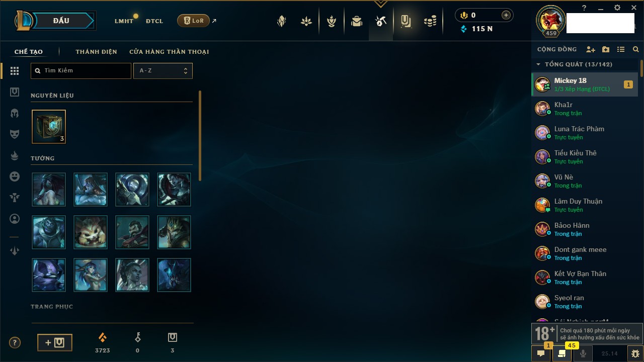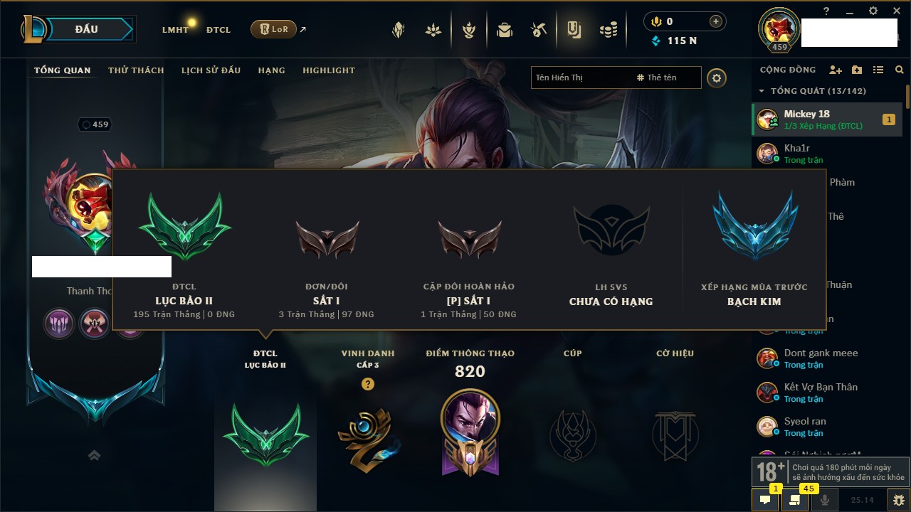 Rank Đơn: Bạc IIKhung: Bạch kimTướng: 169 - Còn 81813 THXTrang Phục: 301Rank ĐTCL: Chưa RankLinh Thú: 140