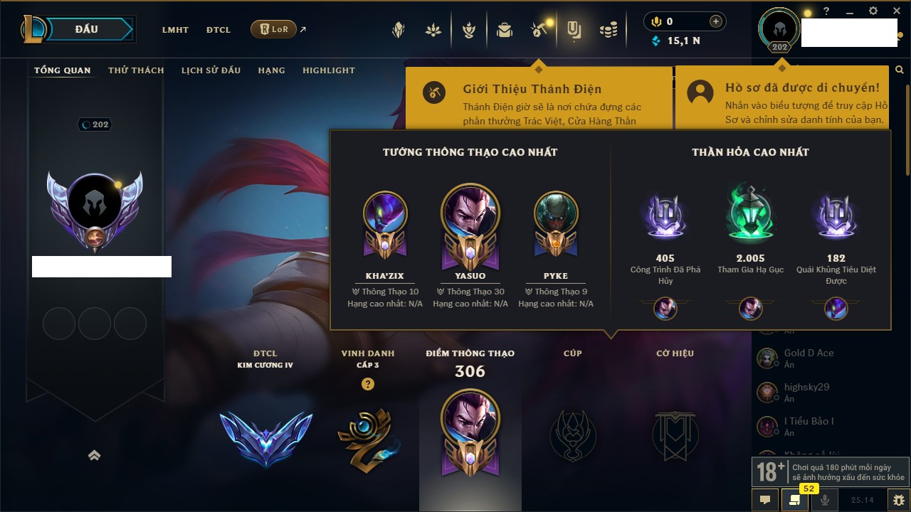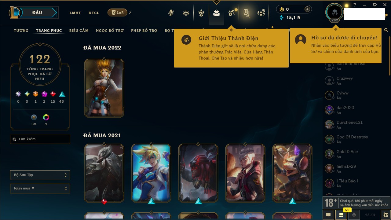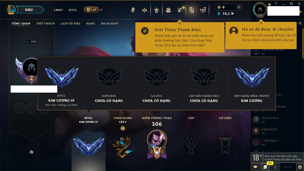 Rank Đơn: Chưa RankKhung: Chưa có khungTướng: 118 - Còn 13712 THXTrang Phục: 117Rank ĐTCL: Chưa RankLinh Thú: 34
