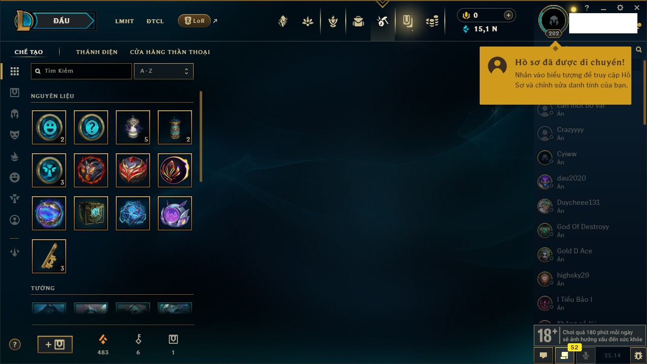 Rank Đơn: Chưa RankKhung: Chưa có khungTướng: 165 - Còn 3214 THXTrang Phục: 160Rank ĐTCL: Chưa RankLinh Thú: 28