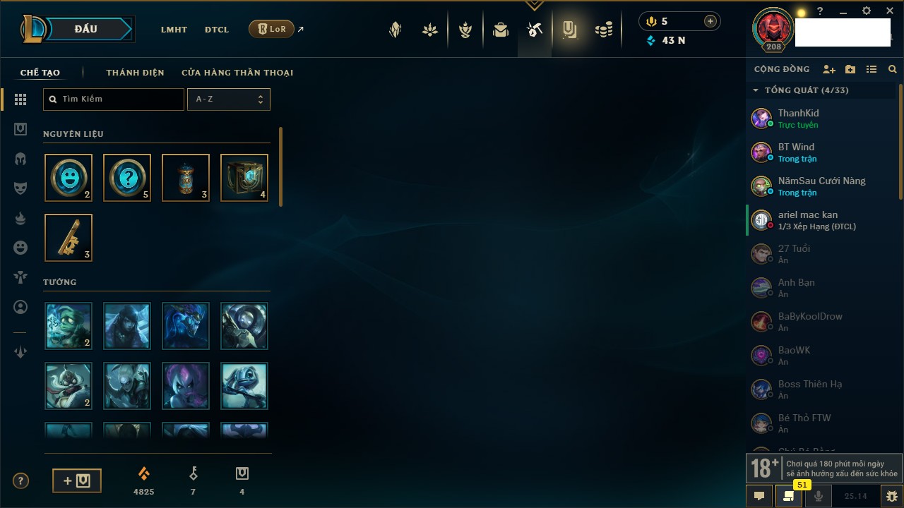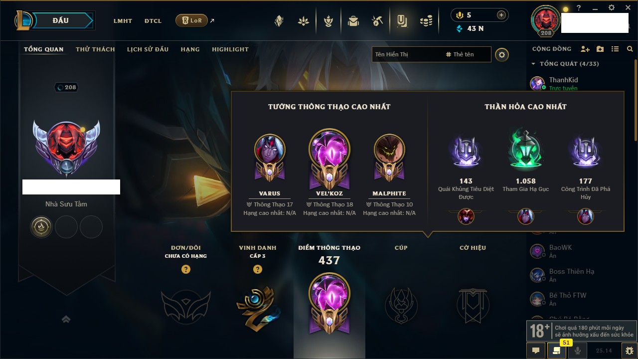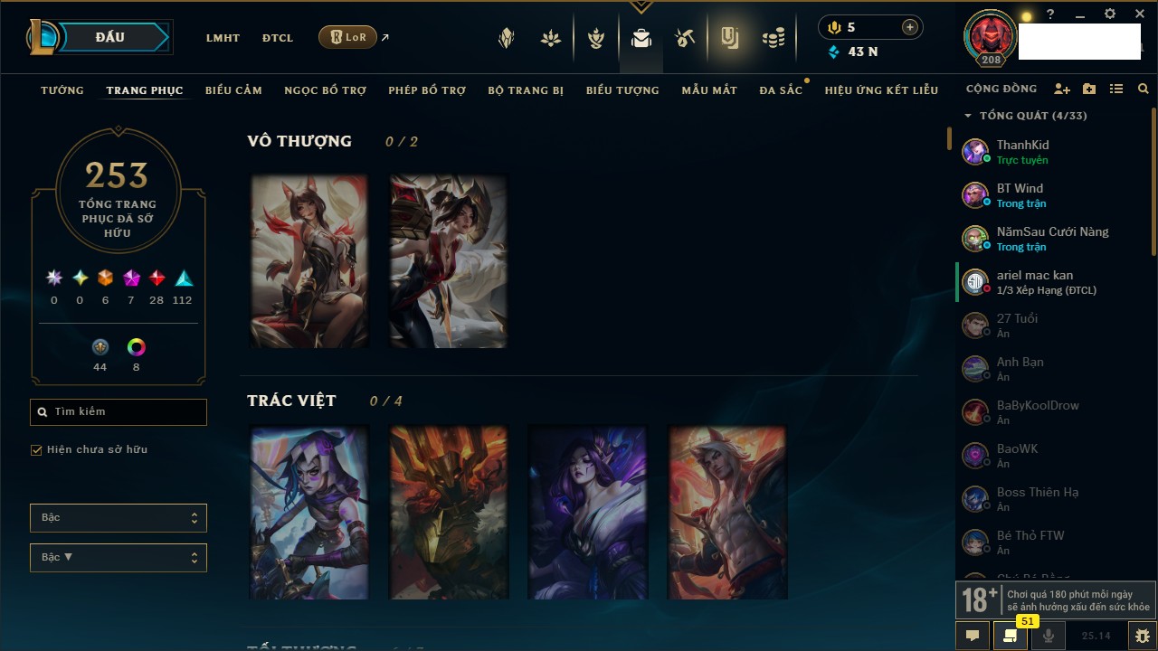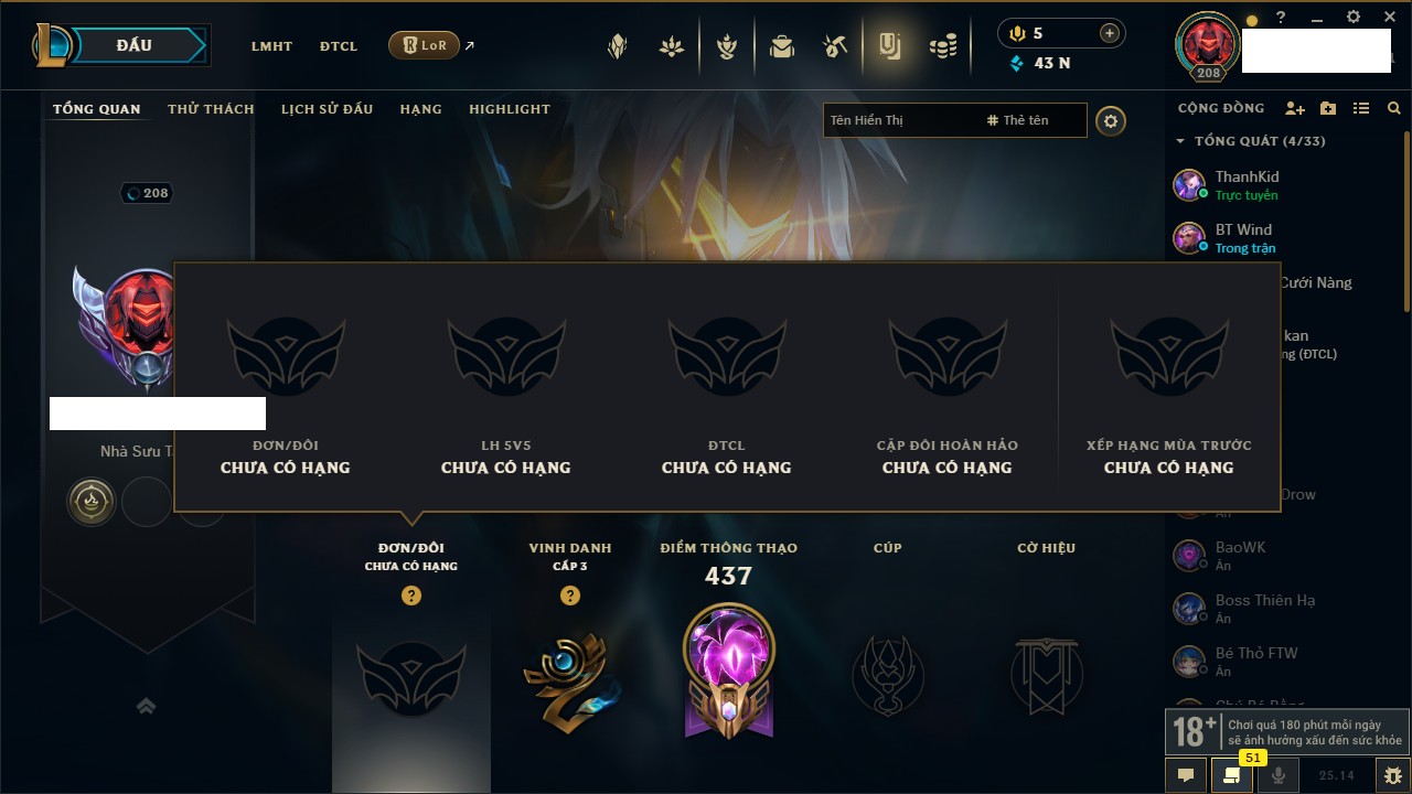 Rank Đơn: Bạch Kim IIKhung: Bạch kimTướng: 171 - Còn 316137 THXTrang Phục: 89Rank ĐTCL: Bạch Kim IIILinh Thú: 94