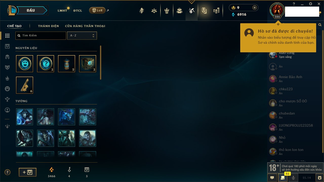 Rank Đơn: Bạc IVKhung: VàngTướng: 172 - Còn 358384 THXTrang Phục: 177Rank ĐTCL: Lục Bảo IILinh Thú: 211