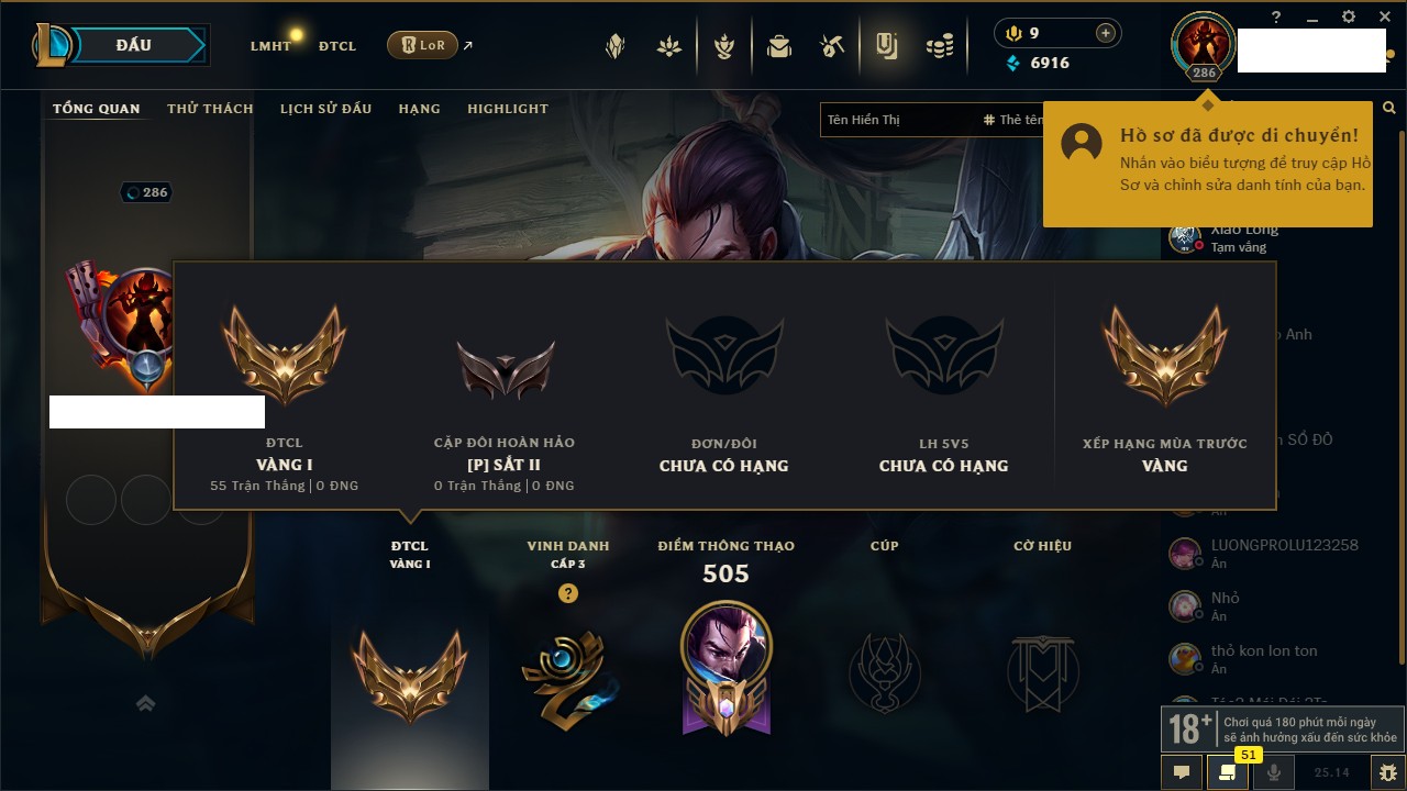 Rank Đơn: Sắt IKhung: SắtTướng: 171 - Còn 125789 THXTrang Phục: 151Rank ĐTCL: Đồng IIILinh Thú: 72