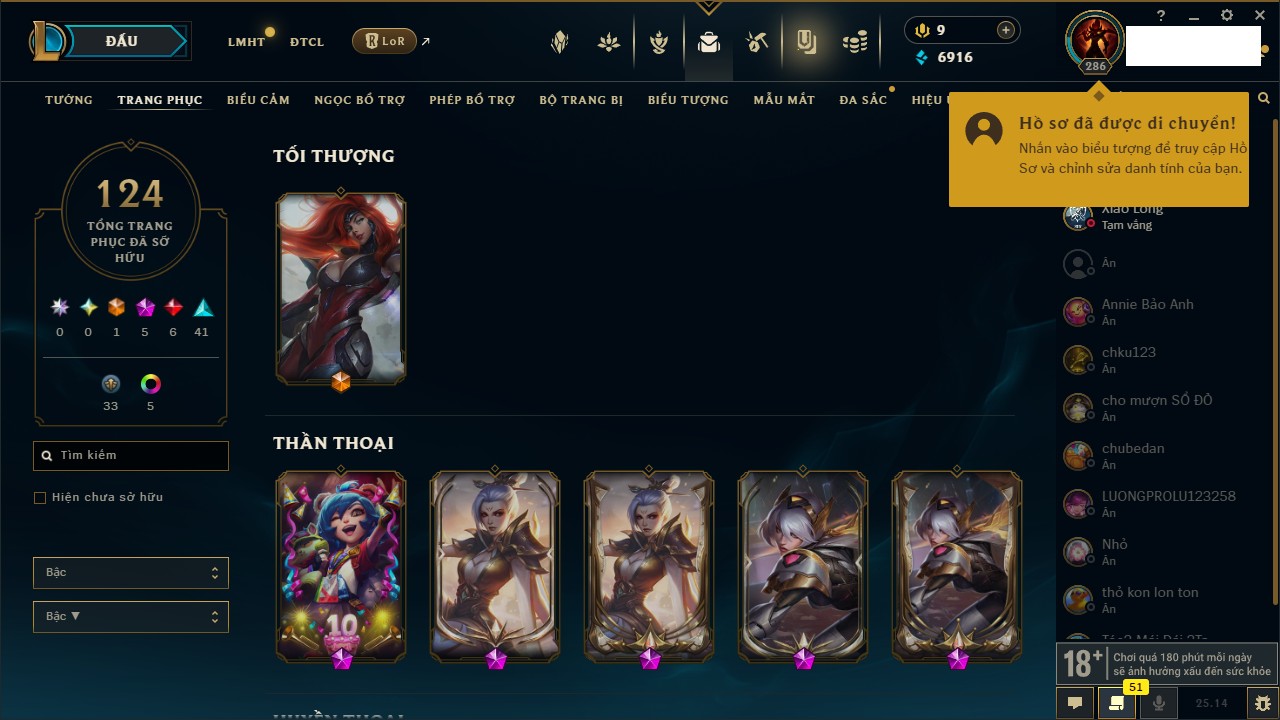 Rank Đơn: Vàng IVKhung: BạcTướng: 171 - Còn 426239 THXTrang Phục: 162Rank ĐTCL: Chưa RankLinh Thú: 33