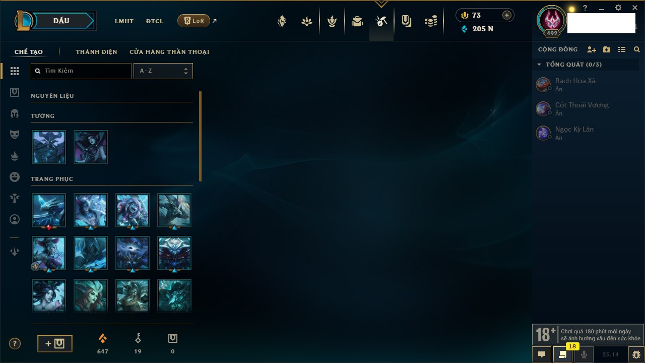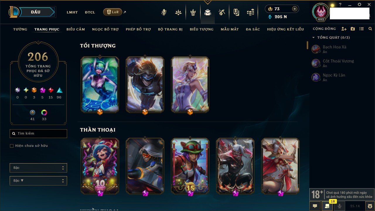 Rank Đơn: Vàng IIKhung: VàngTướng: 171 - Còn 219803 THXTrang Phục: 254Rank ĐTCL: Chưa RankLinh Thú: 78