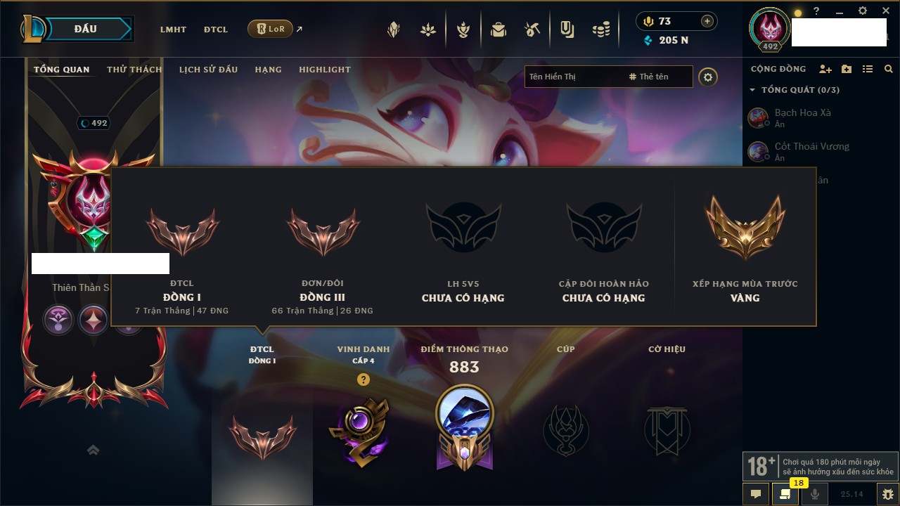 Rank Đơn: Sắt IIIKhung: SắtTướng: 171 - Còn 62070 THXTrang Phục: 198Rank ĐTCL: Bạch Kim IIILinh Thú: 237