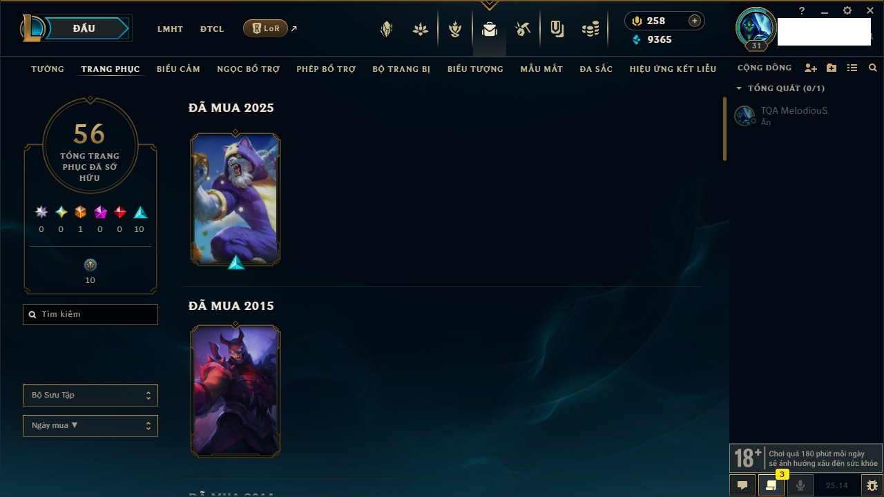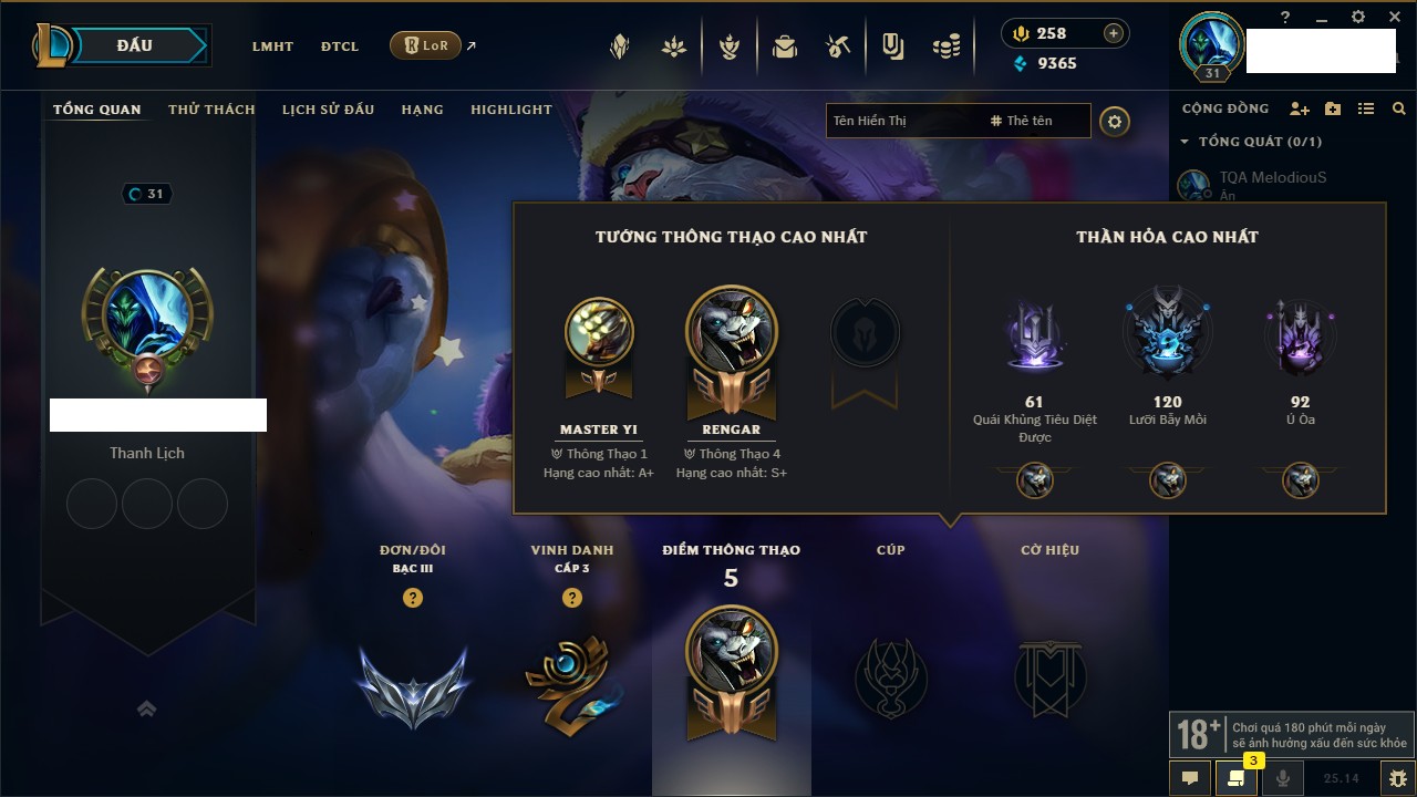 Rank Đơn: Chưa RankKhung: Chưa có khungTướng: 170 - Còn 72514 THXTrang Phục: 202Rank ĐTCL: Chưa RankLinh Thú: 191