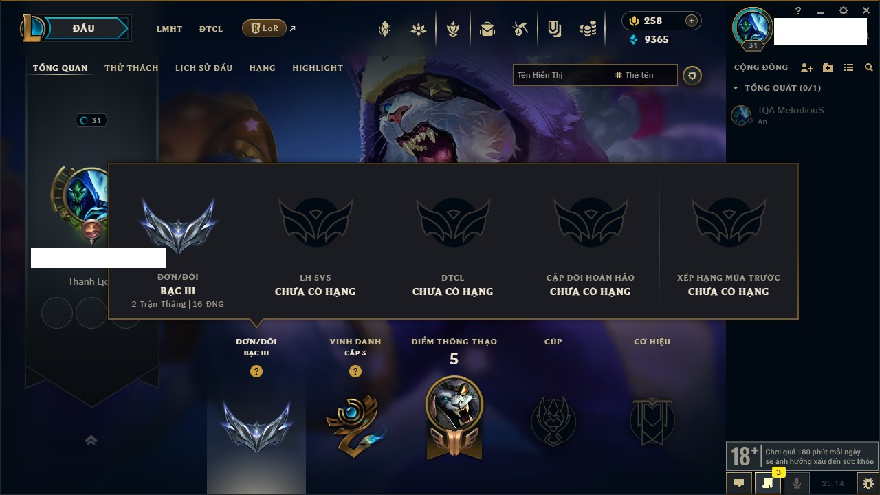 Rank Đơn: Chưa rank mùa nàoKhung: Chưa có khungTướng: 1 - Còn 3000 THXTrang Phục: 0Rank ĐTCL: Vàng ILinh Thú: 6