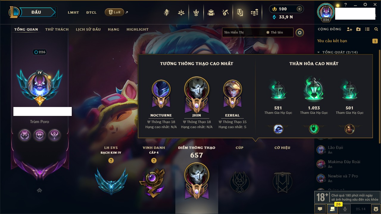 Rank Đơn: Bạch Kim IVKhung: Bạch kimTướng: 171 - Còn 54021 THXTrang Phục: 327Rank ĐTCL: Chưa RankLinh Thú: 115