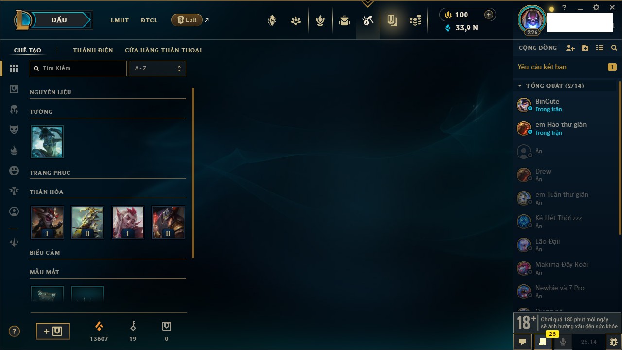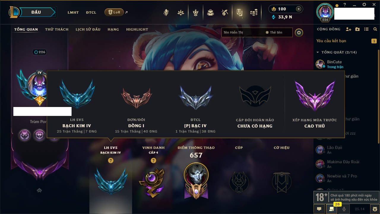 Rank Đơn: Bạch Kim IIIKhung: Bạch kimTướng: 171 - Còn 251383 THXTrang Phục: 229Rank ĐTCL: Sắt IILinh Thú: 51