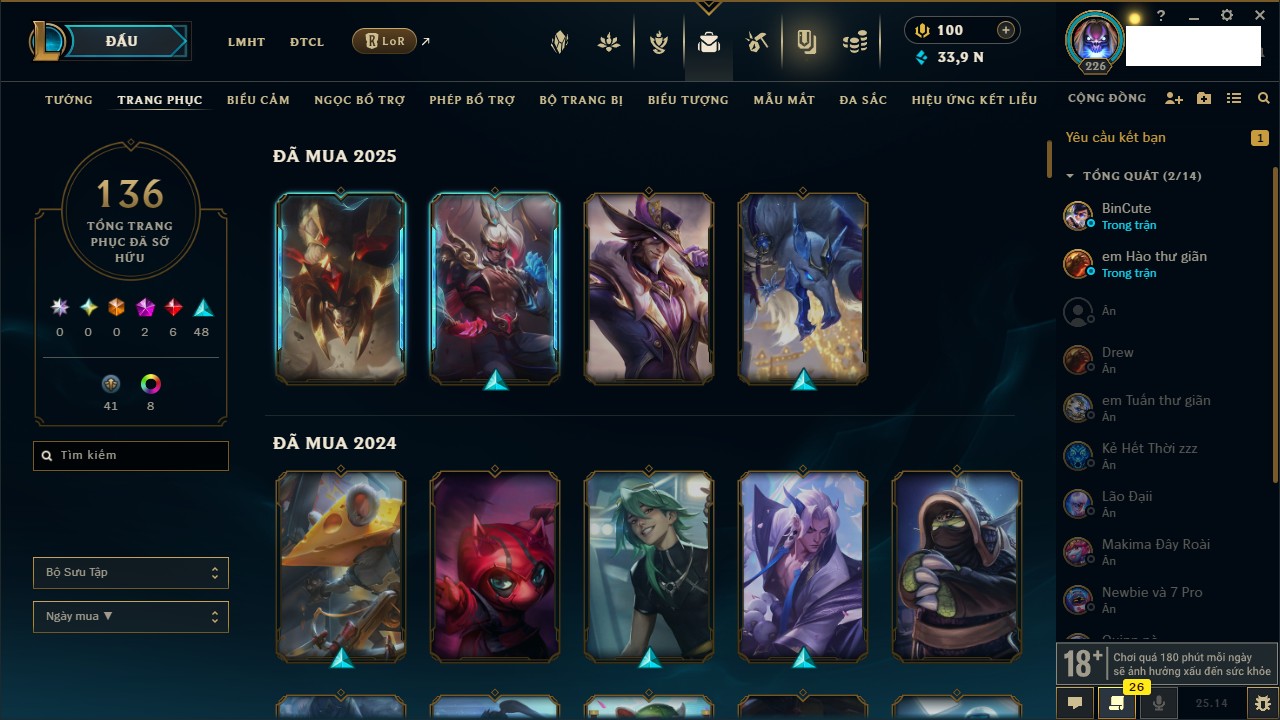 Rank Đơn: Vàng IIIKhung: VàngTướng: 171 - Còn 88128 THXTrang Phục: 329Rank ĐTCL: Chưa RankLinh Thú: 41